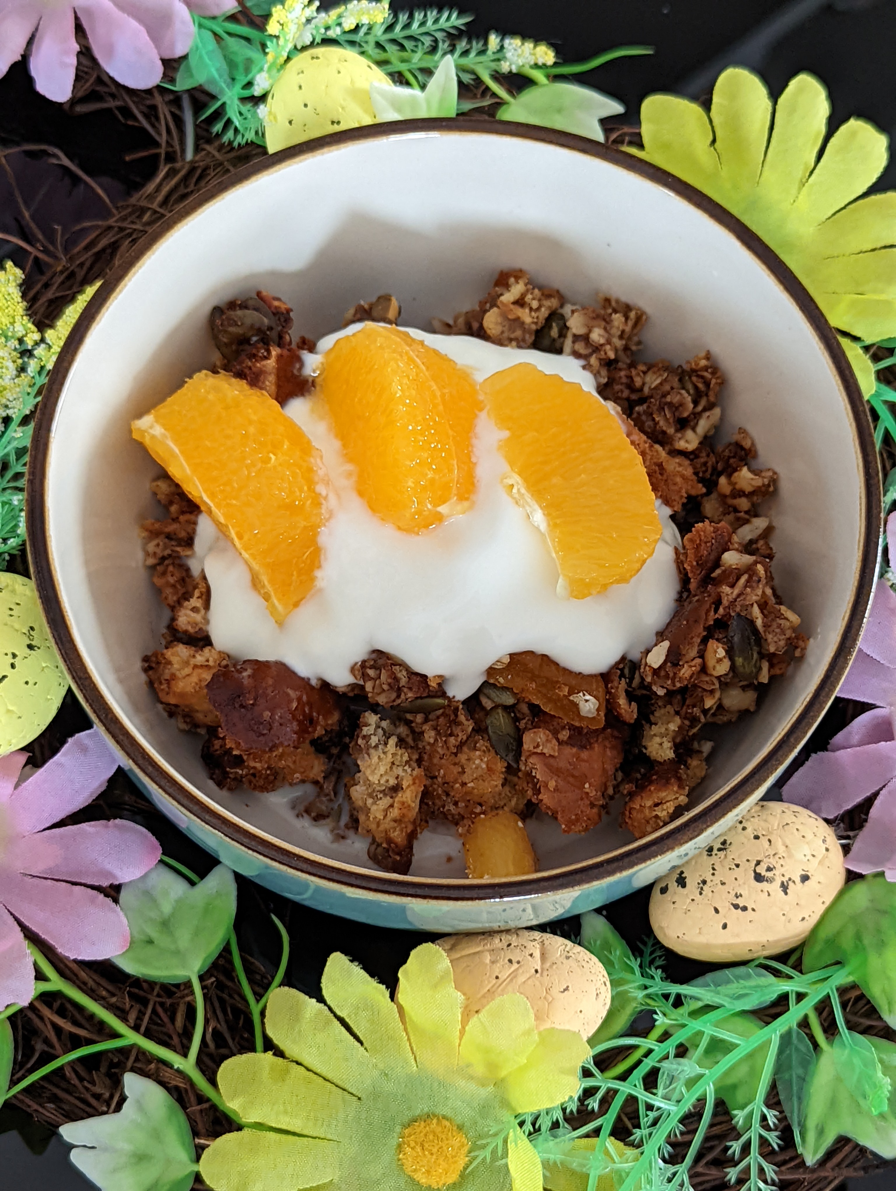 This is a wonderful way to wake up in the morning and can easily be stored for up to a week for some batch prepping! Tear up your hot cross buns (2-3) and coat them in 50g melted butter, and a little sugar before baking in the oven (170C fan) for 10 mins. In a bowl combine 2 tbsp honey, 1 tsp vanilla, splash of veg oil, 50g each of oats, mixed chopped nuts & pumpkin seeds with orange zest and some cinnamon. Add to the hot cross bun pieces and bake until golden and crispy. Once cooled, break into pieces and add some of your favourite dried fruit, like dried apricots chopped up. Serve with a dash of milk, top with yogurt and fruit for a tasty breakfast option.