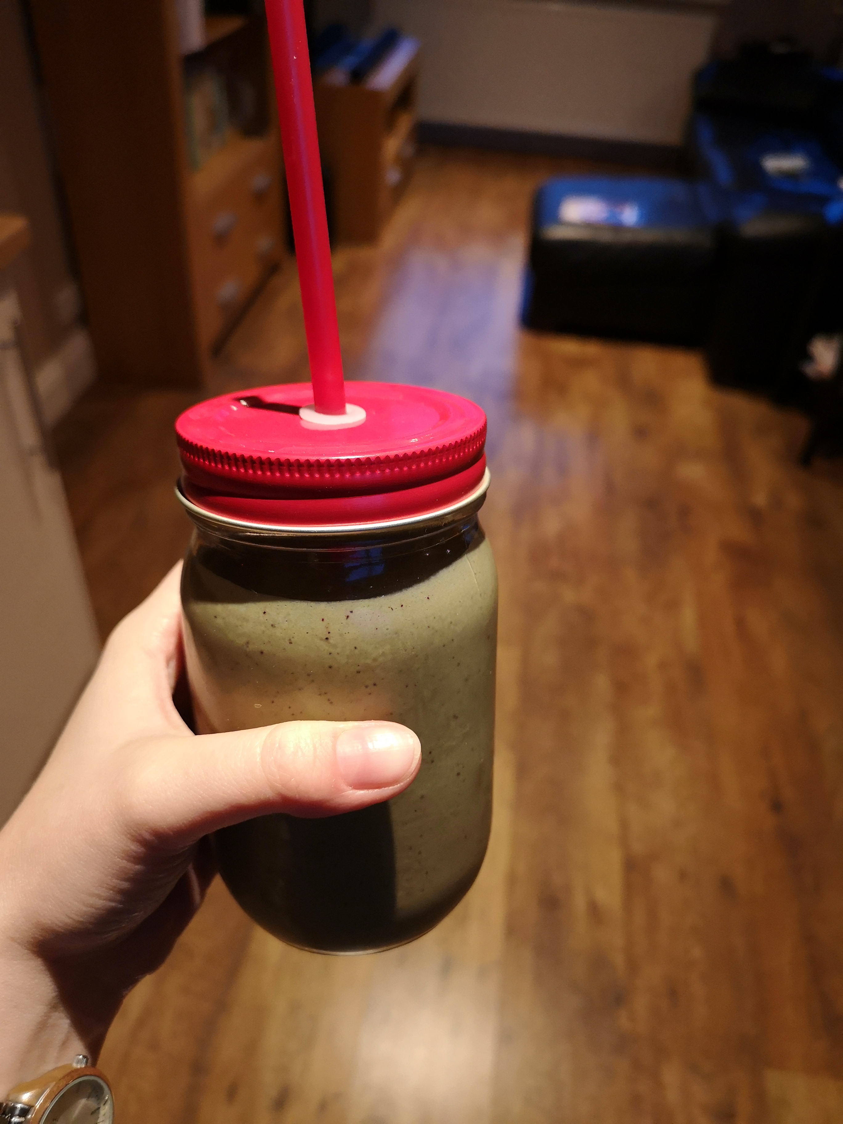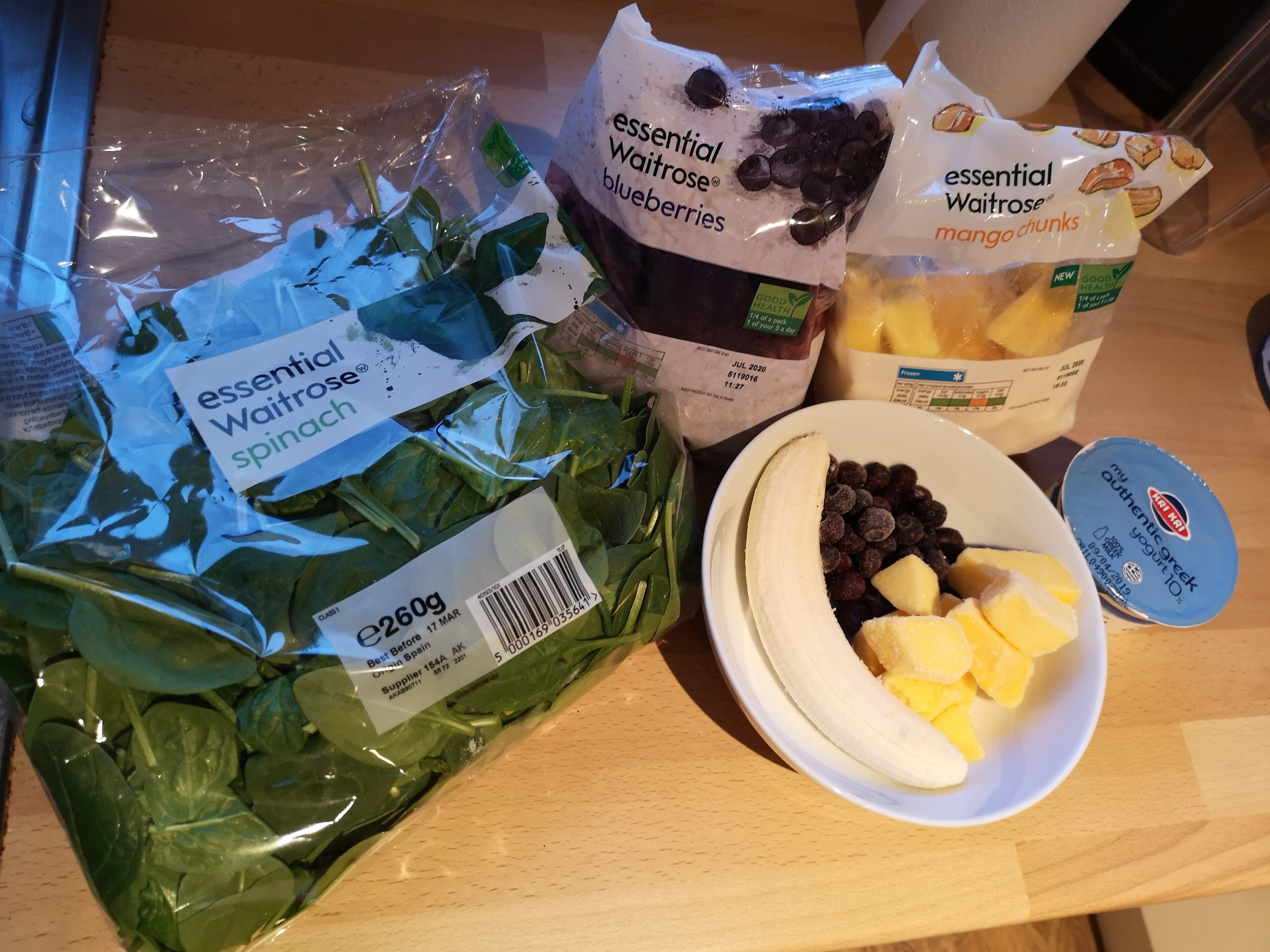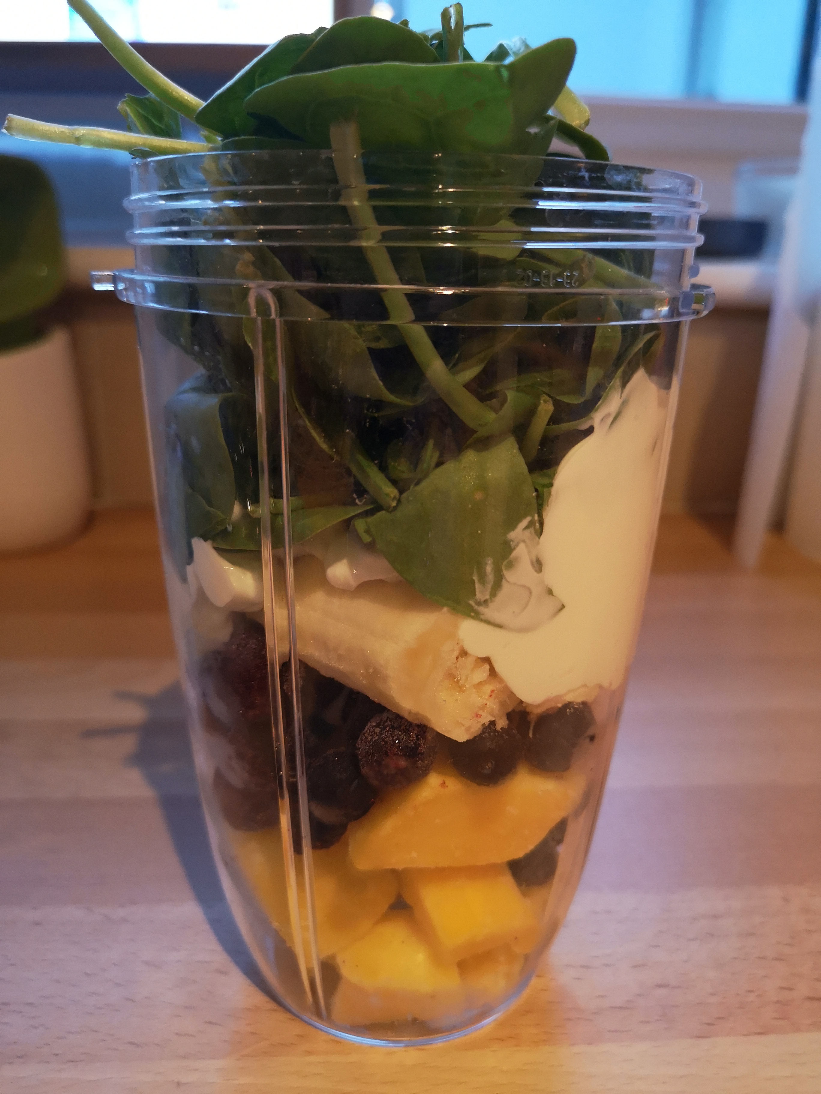 I tend to chuck in a banana (fresh or frozen), Greek yogurt, a teaspoon of chia seeds and other fruit I have available. I always have a stash of frozen fruits & vegetables and these are an ideal way to help to cool your smoothie, without adding ice and a great way to make sure you get even more of your 5 a day. Blitz it all up and enjoy your green smoothie on the go!