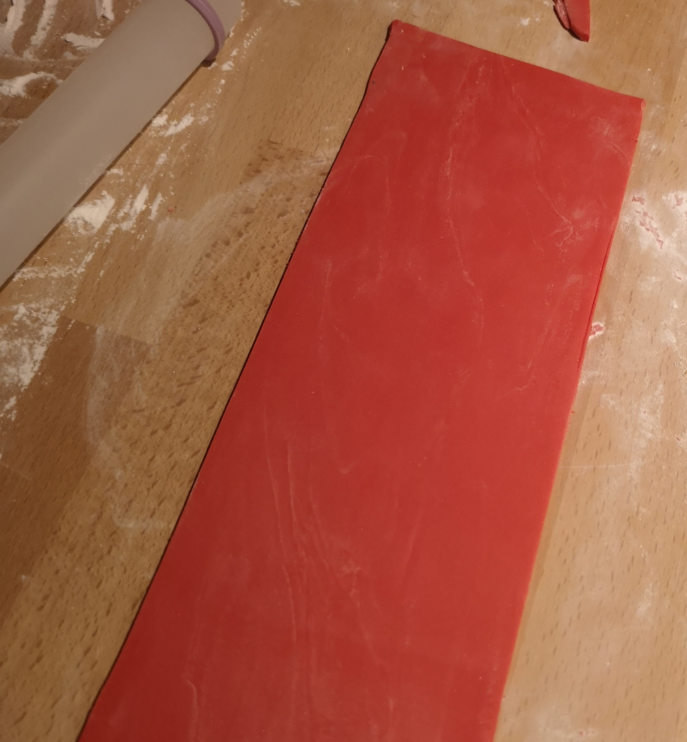 The time had come, with everything cooled & set overnight, to start on the construction & final decoration. Starting with the cake, I cut this horizontally & applied a layer of buttercream & jam before putting on a rough crumb coating. Whilst this firmed up in the fridge I took the opportunity to roll out the red fondant.
