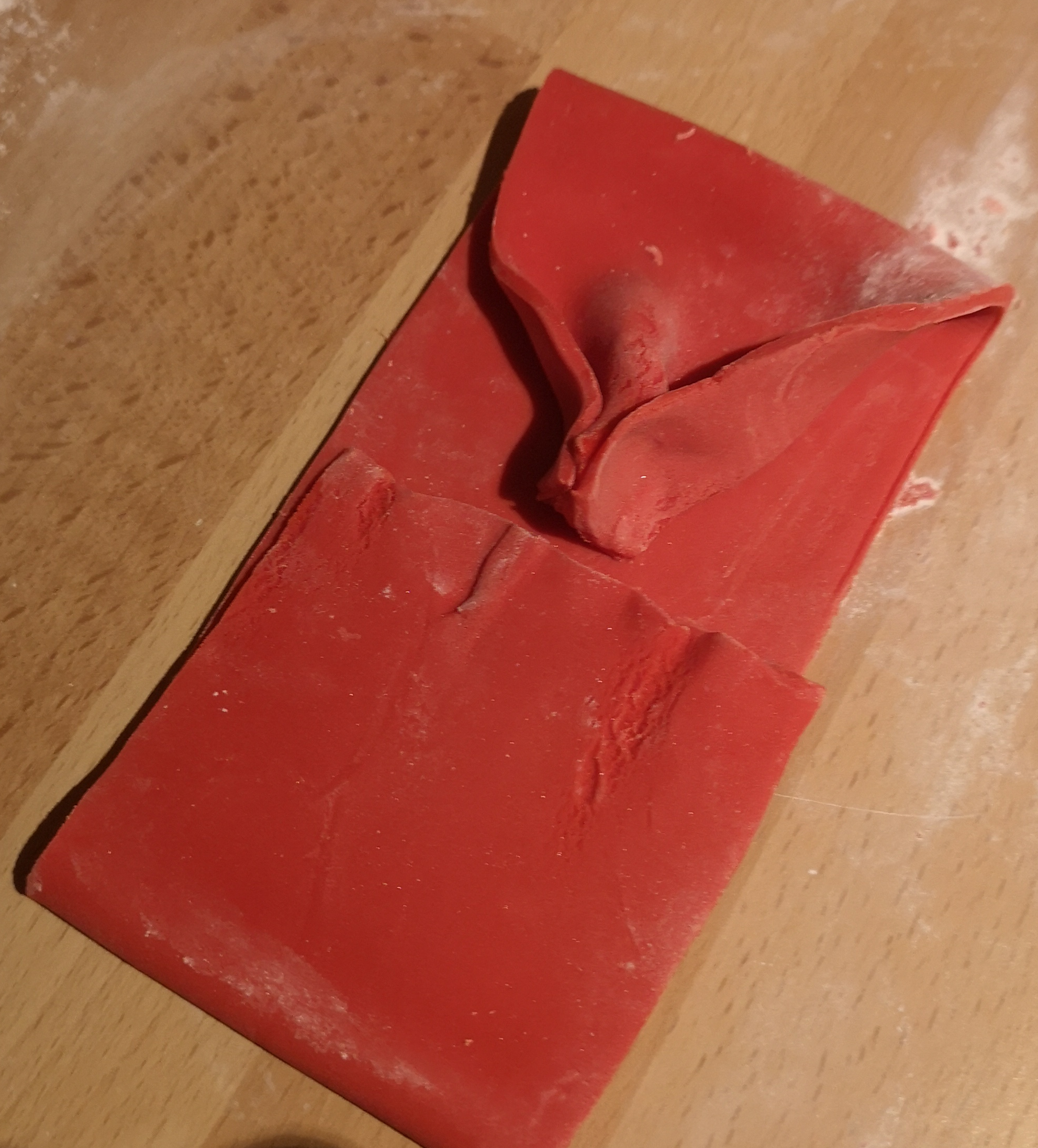 The hardest part of the bake for me was the flower paste bow, but I ended up quite chuffed with my first attempt! I had watched several videos online, and thankfully knew to use the flower paste for this construction. I started by measuring out the two rectangles I would need for the bow and the centre wrap. Then I carefully folded the bigger rectangle in half to meet in the middle at what would become the back of the bow.