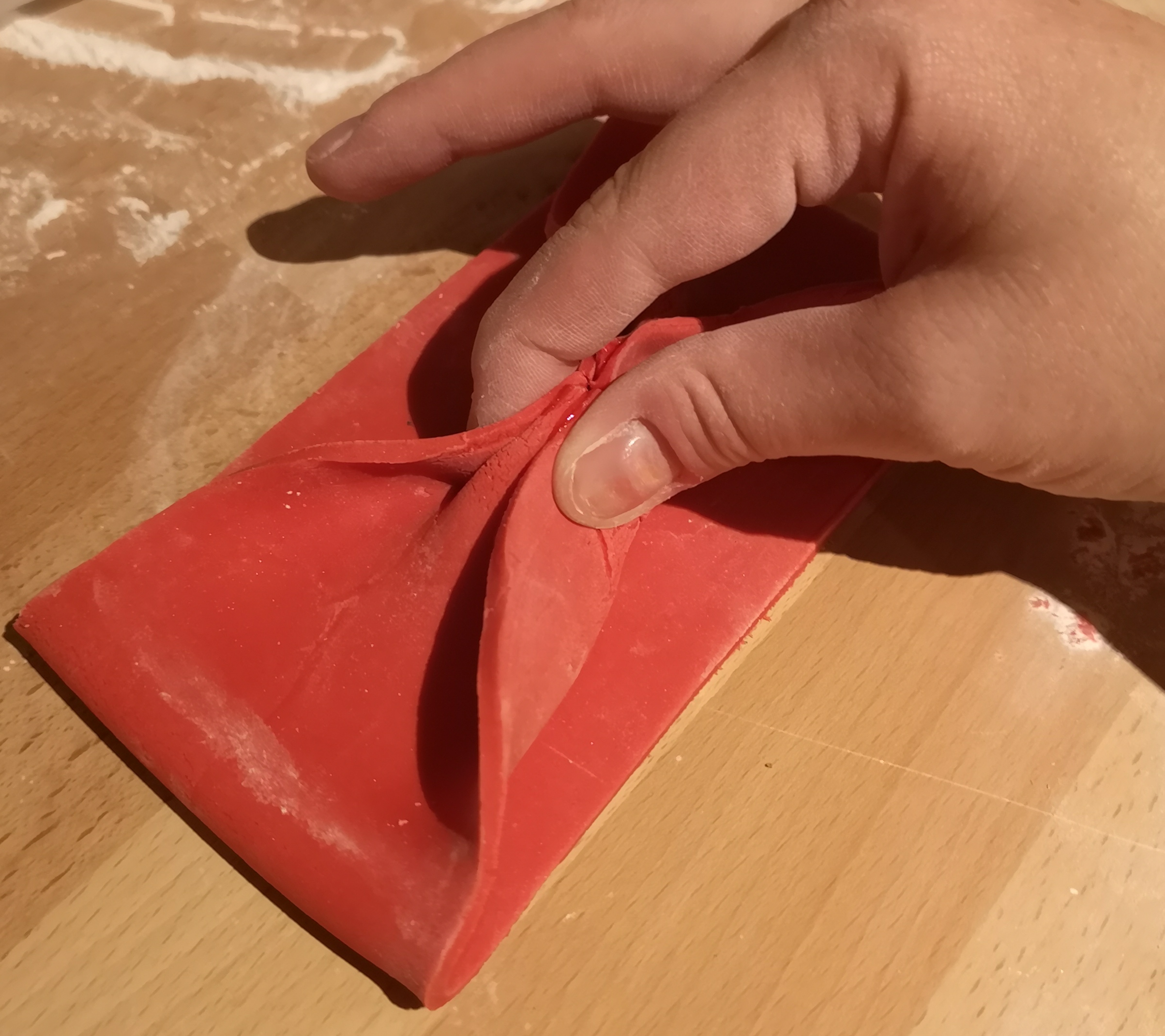From here I folded the sides of the bow back into an almost W shape and pinched it together to create the folds. Using some edible glue and a baking paintbrush I then glued this shut. Use the glue sparingly and try not to get it on your fingers! I repeated this on the other side & the pinched the front flat side into the centre using the glued sections as a guide.