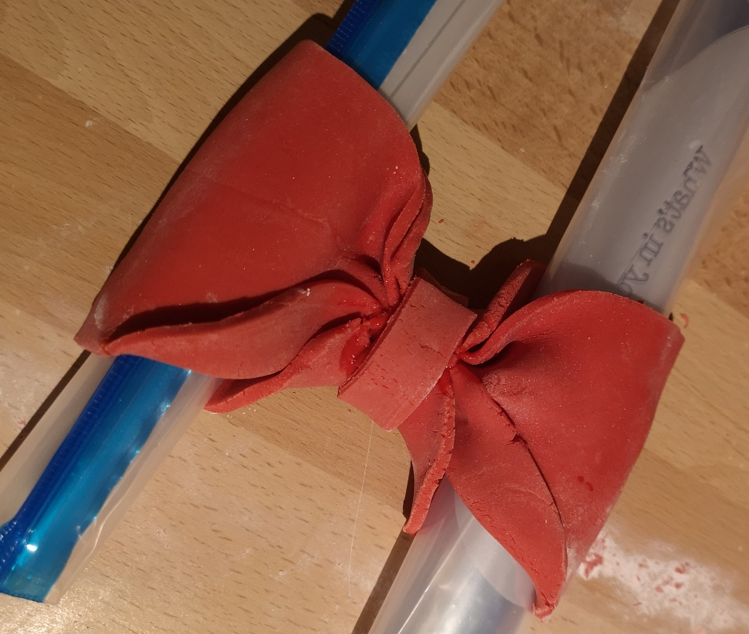 With the bow taking shape I gently rolled the centre smaller rectangle round the middle to form the 'knot' in the bow. I had also read that it was important to keep the bow 3D in structure or it would look flat on the cake ultimately. For this they cleverly recommended tightly rolling two clean food bags and inserting them in the loops of the bow to give it shape. As the bow would end up stood upright on the cake, I also decided to stand it upright for the setting time (24 hours) to end up in the form it would be presented. This gave me a chance to look at the bow and add indentations, extra pleats etc to give it additional shape & make it more realistic.