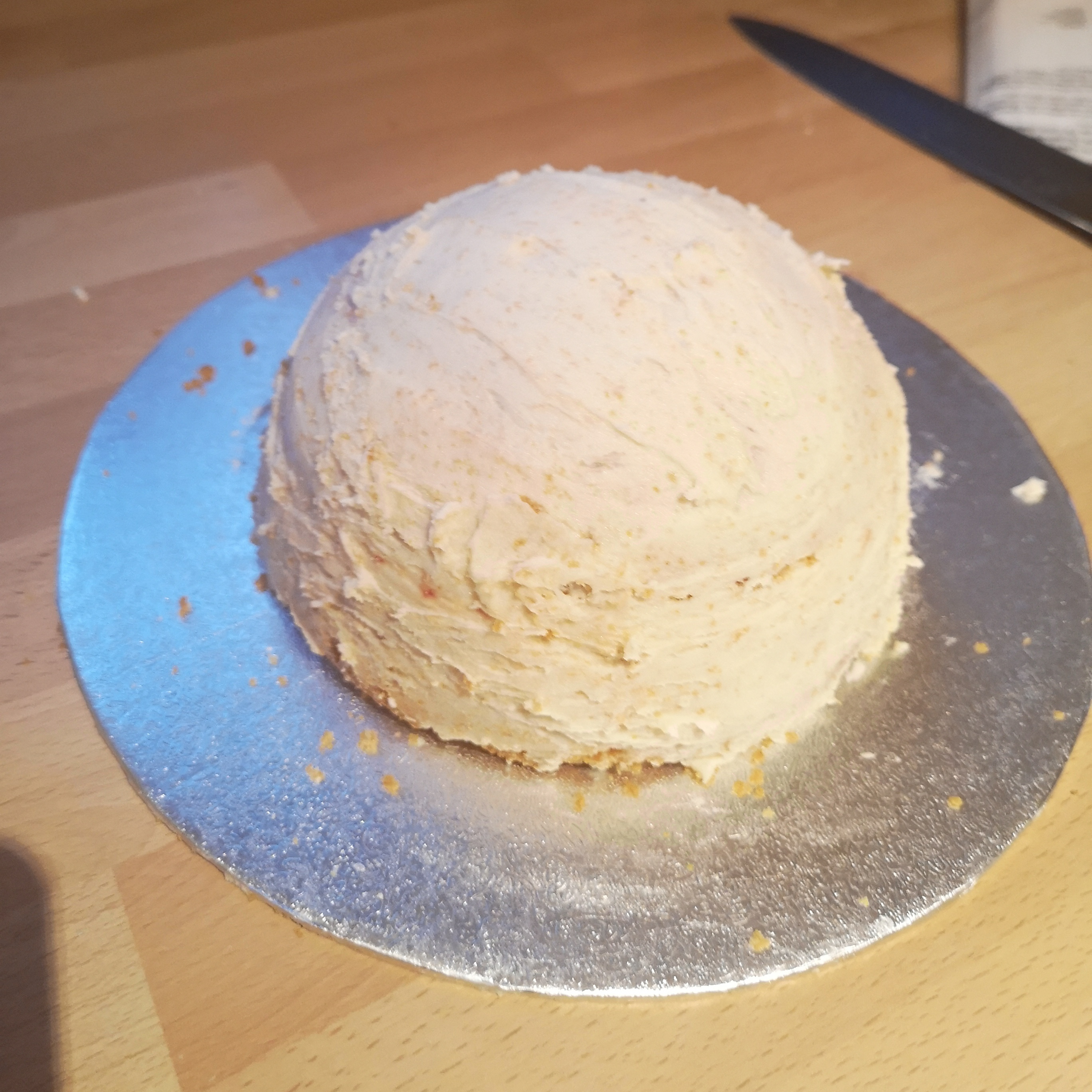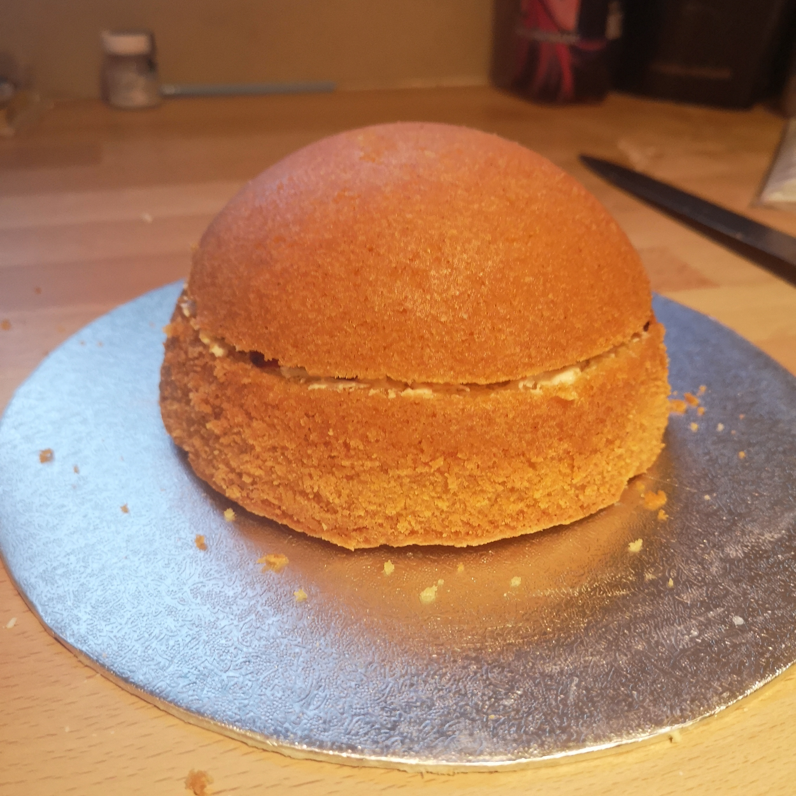 Hemisphere cakes are, thankfully, not as hard as they initially appear. The cake is a fairly standard vanilla sponge recipe, but there are definitely tricks and tips to using the speciality tins. Grease & flour the tin thoroughly, or the cake will definitely stick! Also, you need to stabilise the tin for baking to prevent getting cake batter everywhere in your oven! The best thing I found for this was a metal presentation ring, but be careful it will obviously get hot.