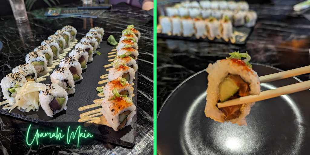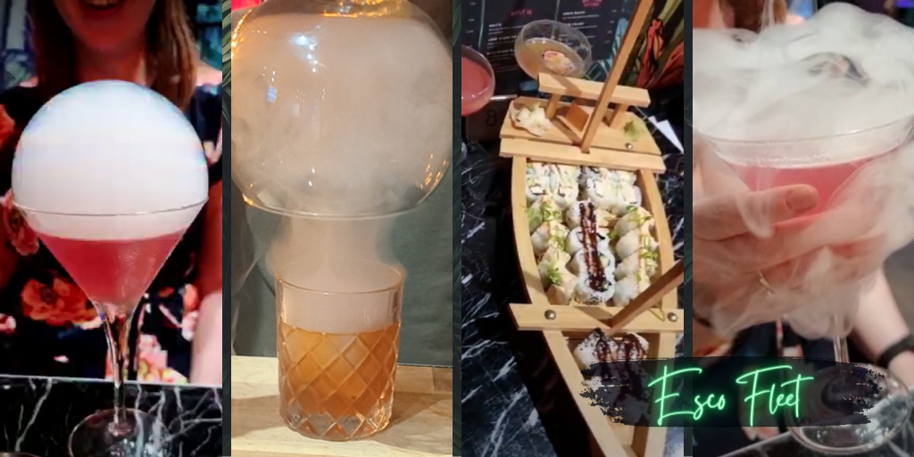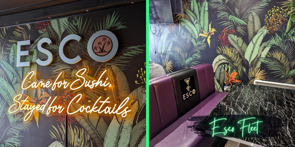 Esco is contemporary in design, with a buzzing energy from music, bartenders making impressive cocktails and platters of delicious and gorgeous sushi and food, all with a flair for presentation being delivered to tables! There are amazing places to take photos, with a modern décor throughout & the vibrant neon signs. Plus the kitchen and bar have an open front to the restaurant where you can feel the passion from the chefs and bartenders to present a fun-filled evening!