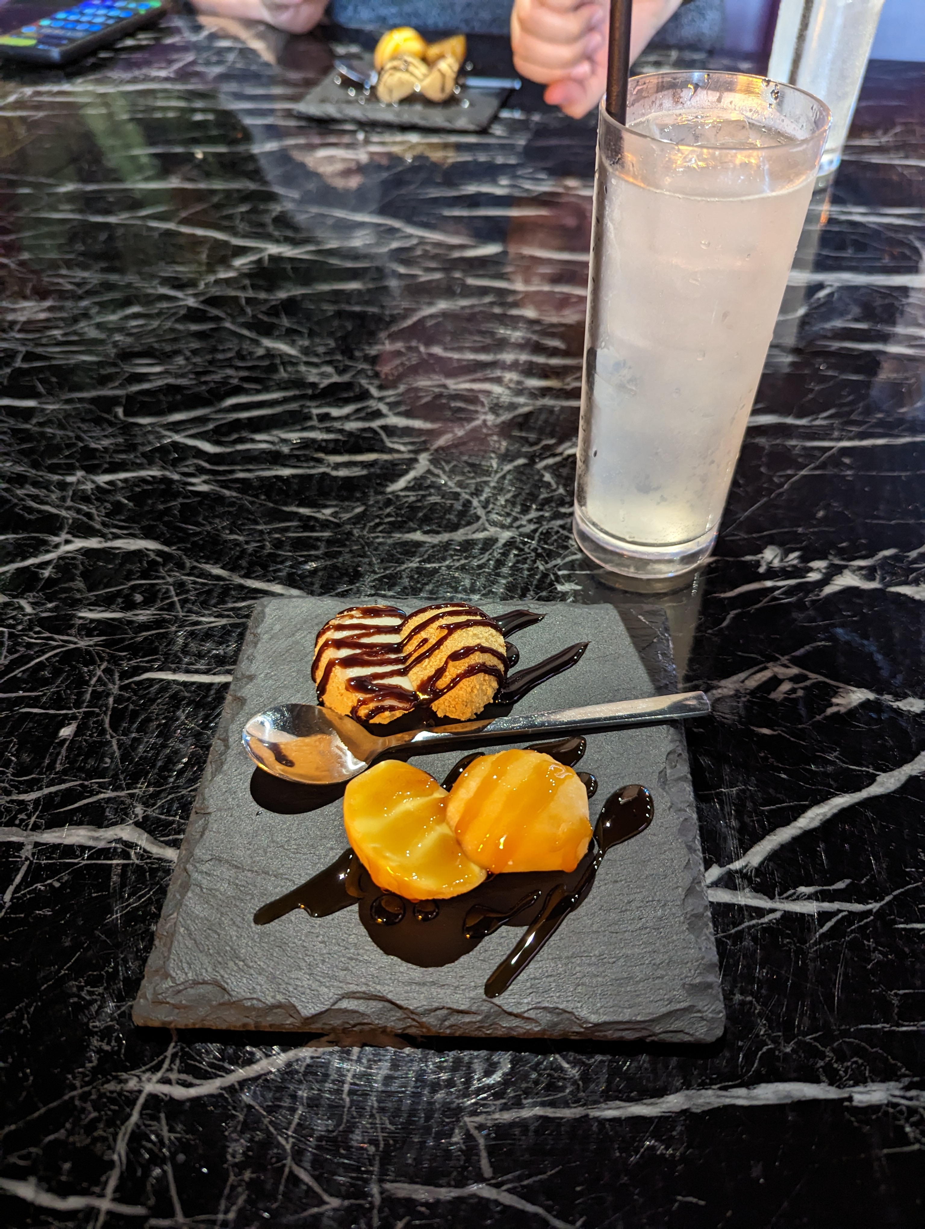 On my previous visits I fell in love with the fantastic sushi options & presentation on our sushi boat! Plus the theatrical cocktails like the Cosmopolitan and the Old Fashioned as below!