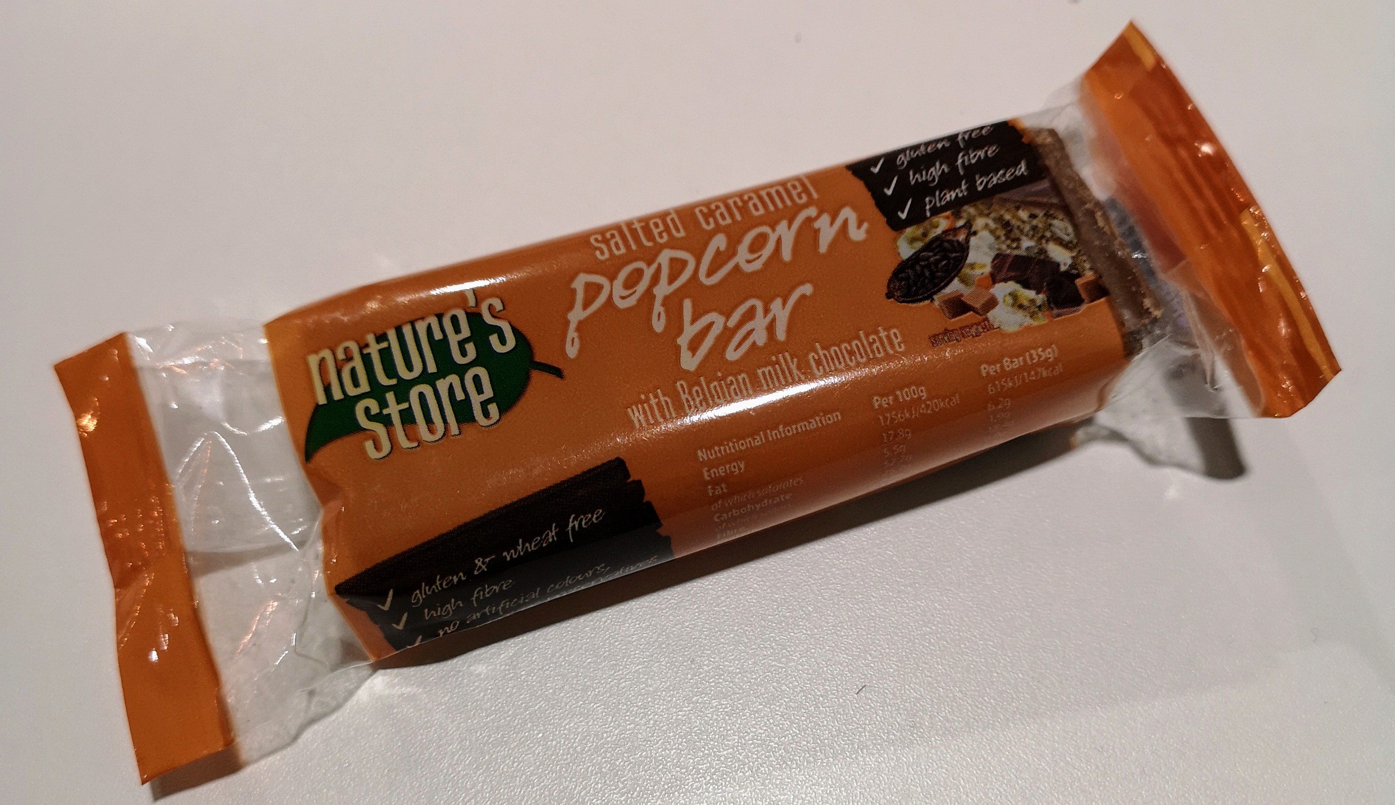 Nature's Store Salted Caramel Popcorn bar - great high fibre, gluten free cereal bar made with popcorn, seeds, dates, gluten free oats and no added sugar chocolate topping. Very tasty & felt like a naughty treat! Will keep an eye out for these in supermarkets soon.