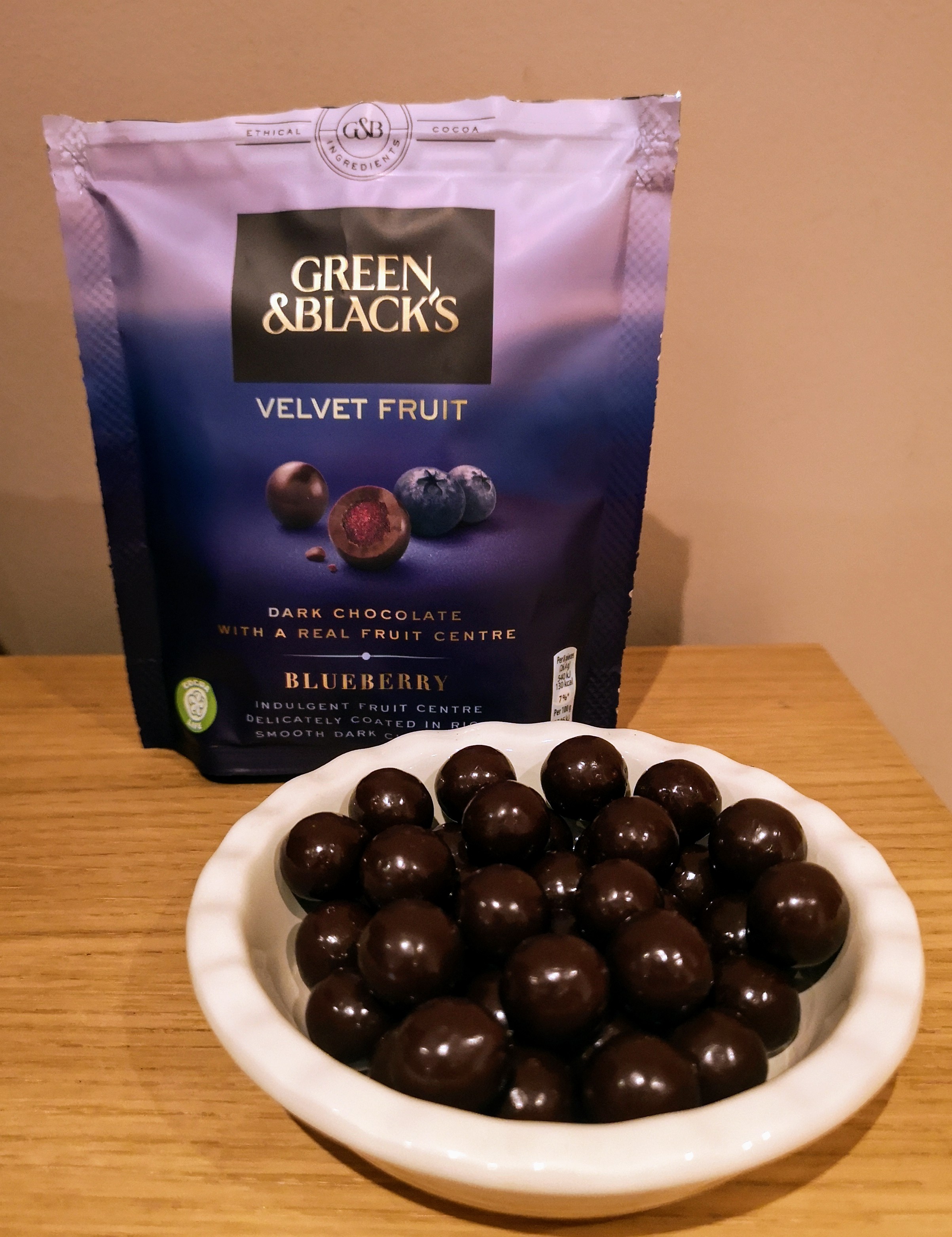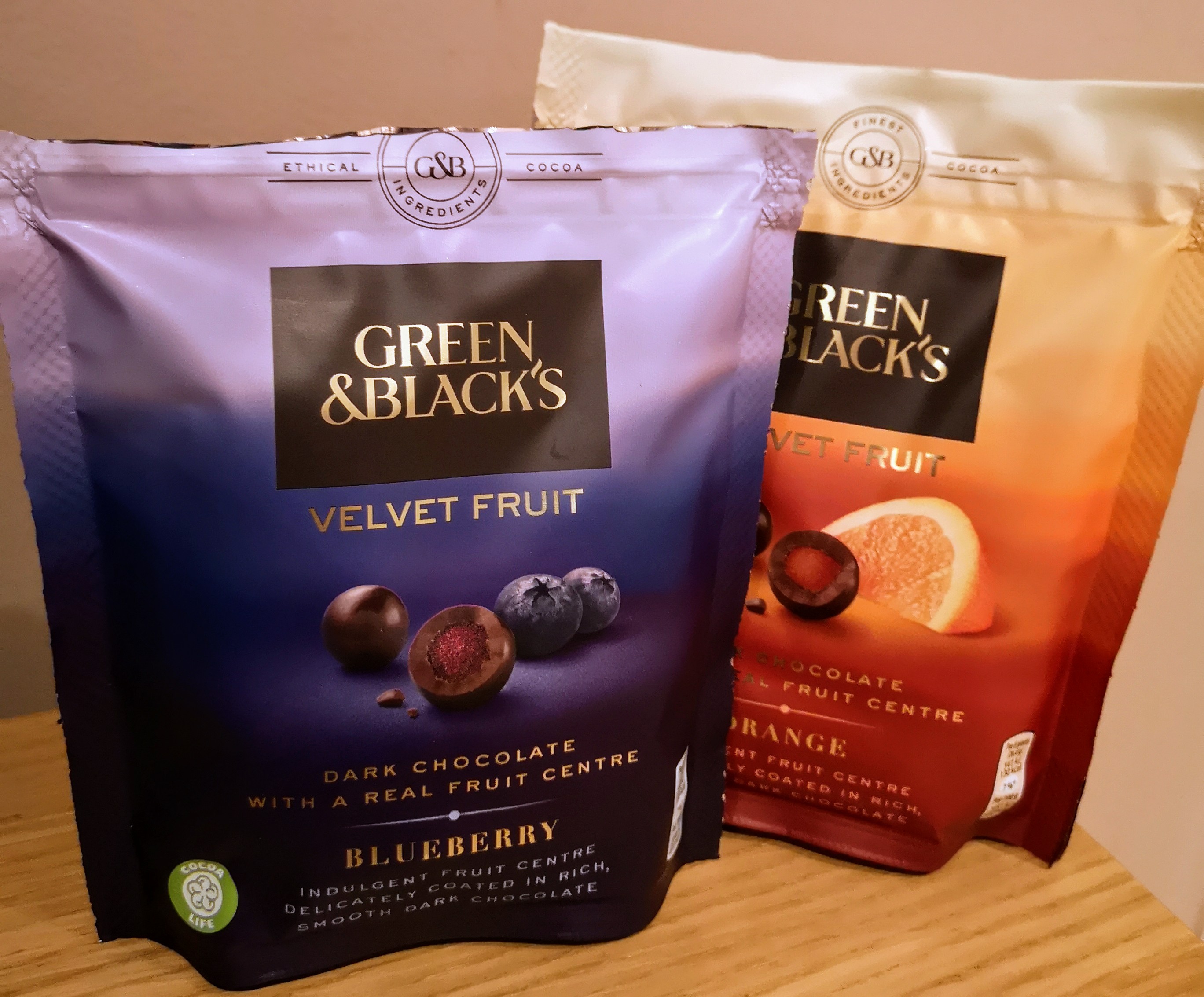 Green & black's Velvet Fruit pouches - Smooth dark chocolate coating a fruity gel centre. I preferred the blueberry to the orange flavour. A different type of sweet treat, but think I'll stick with old fashioned malteasers!