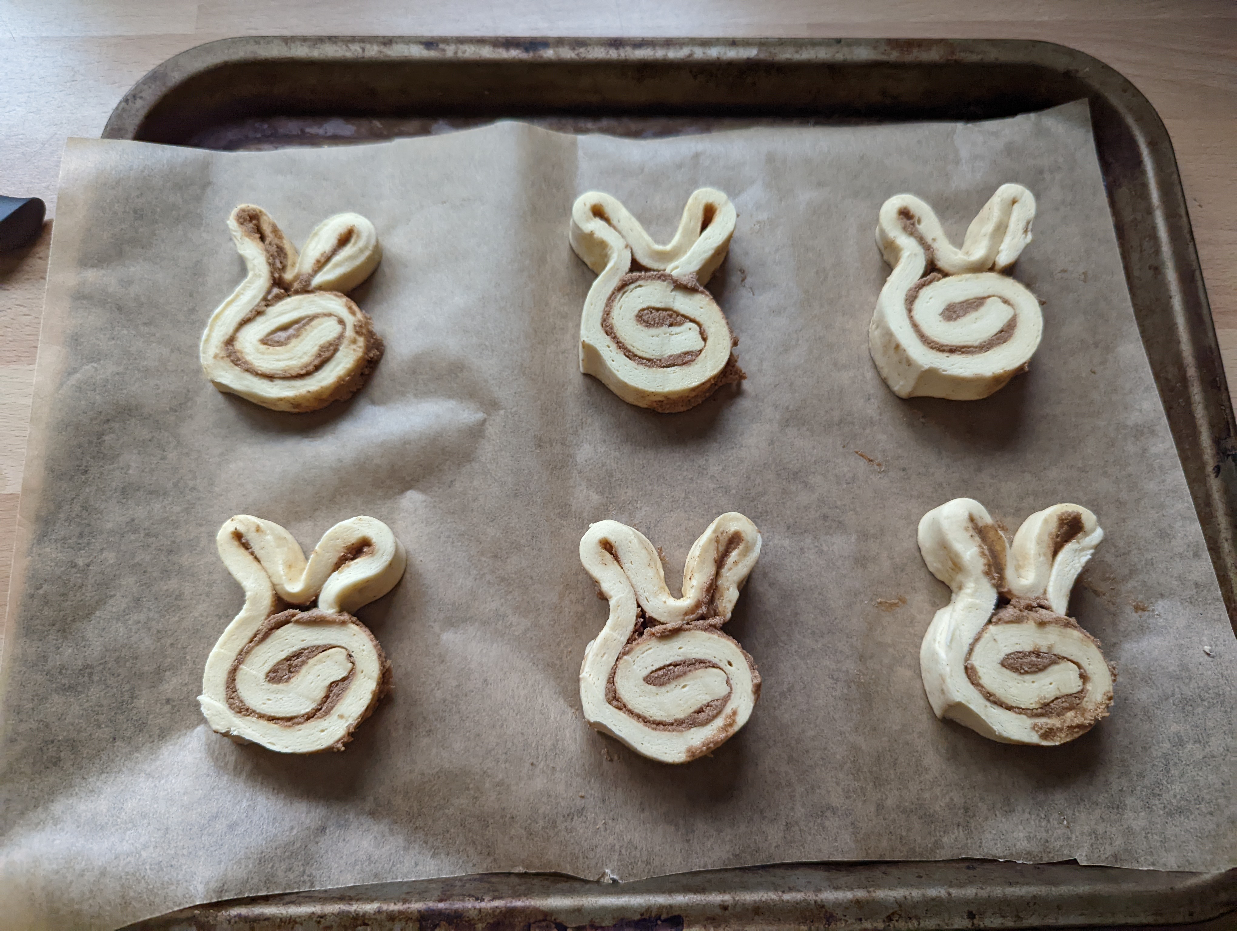 Open the packet per instructions and slice into 6 rounds (or the recommended slices per your tube brand). Then gently unroll about a third of the swirl, this will be a bit messy due to the cinnamon spread in them. Using the unrolled section create two loops on the top of the swirl to make bunny ears!