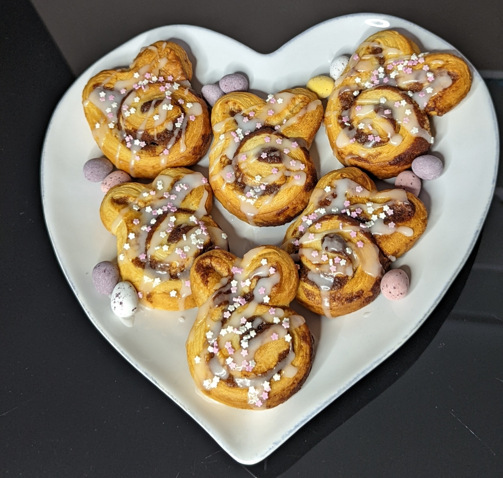 Cook per the instructions, keeping an eye on them for when they are golden brown. In the meantime make the icing in the packet. Once out the oven, allow to cool sightly and then drizzle the icing over the cinnamon bunnies and add some sprinkles as well. Or create a bunny tail using a thicker or coloured bowl of icing, or a bit of squirty cream would look great as well.