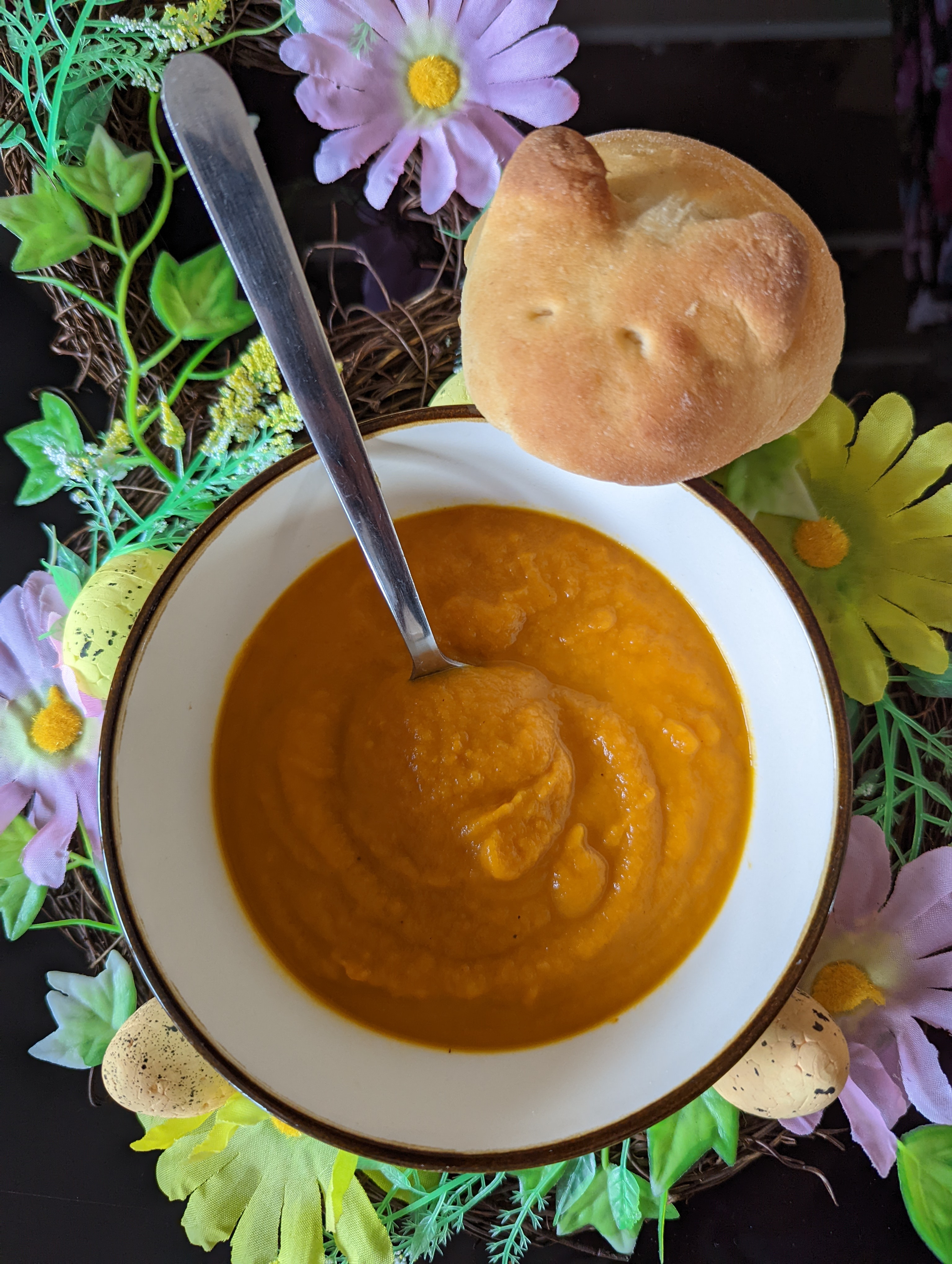 An ideal starter to your Easter lunch, a classic sweet, creamy roasted carrot soup paired with cute bunny bread rolls! For me fresh coriander is a marmite ingredient, love it or hate it (personally I hate it!) so instead I add a depth of flavour to my carrot soup by roasting the carrots first and adding turmeric and ground cumin/coriander. To serve with these I've attempted to make bunny bread rolls, using an easy dinner roll recipe before snipping in some ears and eyes. Although these did not come out perfectly as bunnies, they were still a cute addition to the table!