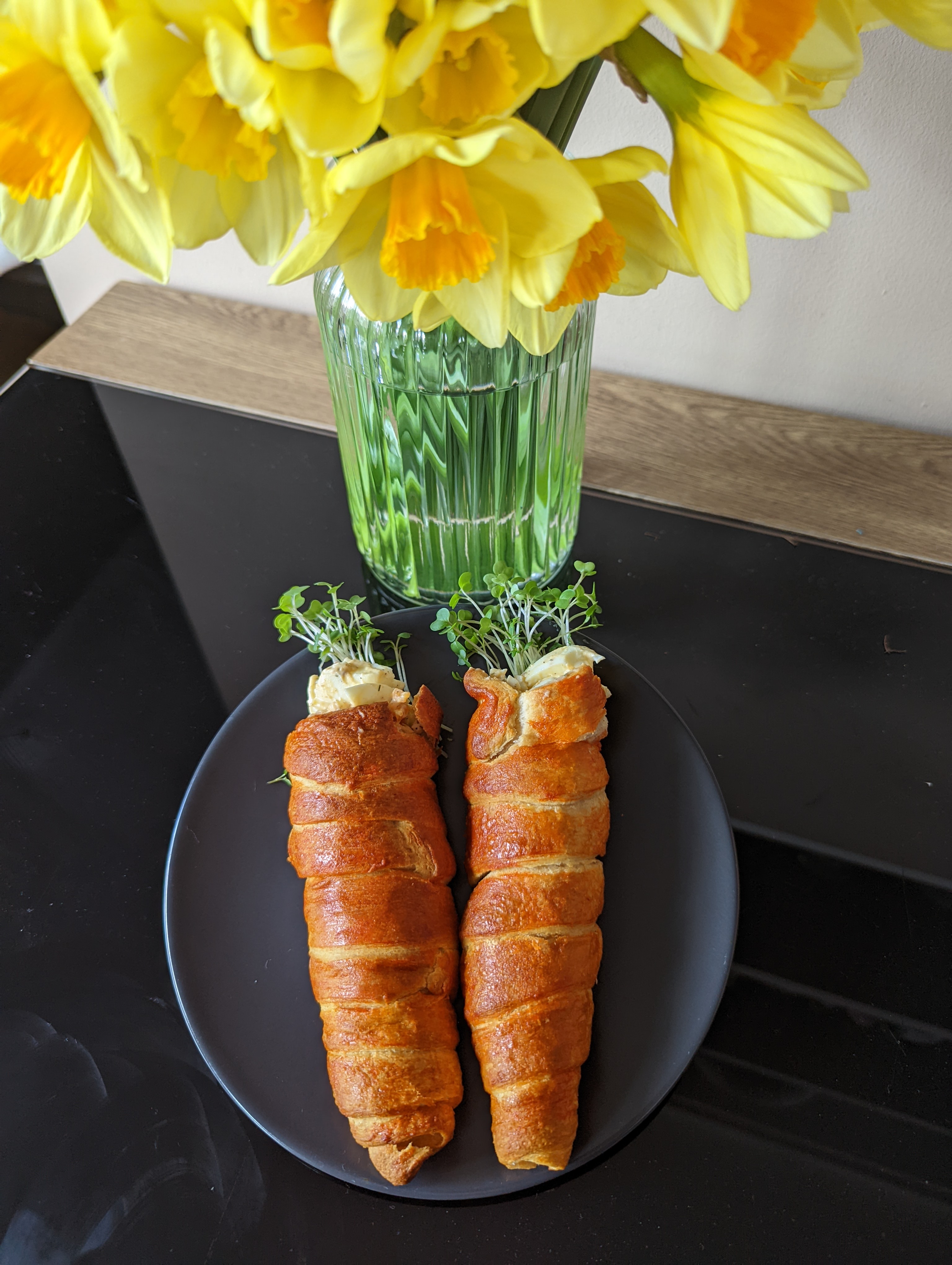 Ready made pastry is an absolute life-saver, especially for special occasions. Create these fun 'carrots' using a roll of croissant dough and fill them with a delicious egg salad, or a vegan, vegetarian or meaty salad instead! To make these I cut the croissant dough into strips and wrapped them around some tinfoil 'horns' or metal cream horn moulds if you have them. Brush with an egg wash, or even with natural orange food colouring for a very vibrant effect! Once filled with a creamy egg salad I topped with some dill to give the effect of carrot tops!