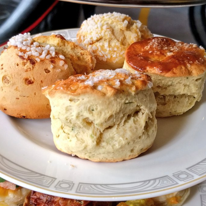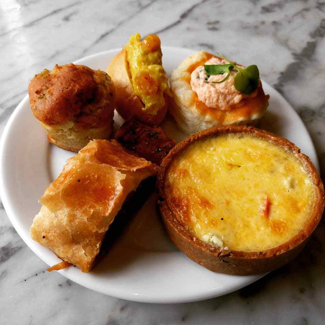 The savoury selection features no traditional finger sandwiches, but a delicious array of small savoury treats. These include a vegetable quiche tart, a pork sausage roll slice, a broccoli & blue cheese muffin, a coronation chicken roll and a classic hot smoked salmon vol-au-vent (which was my favourite!)