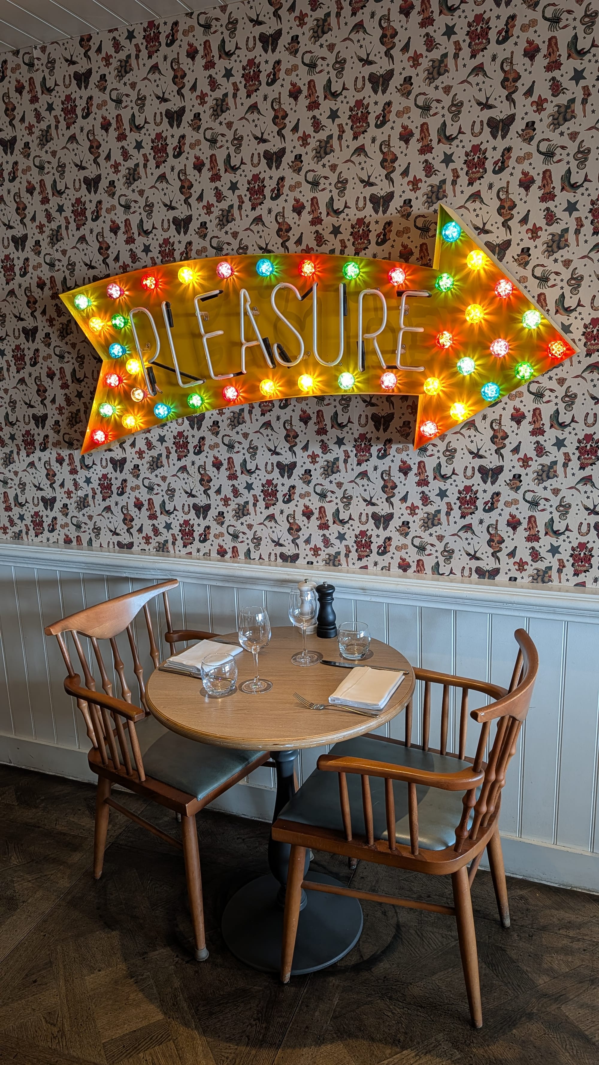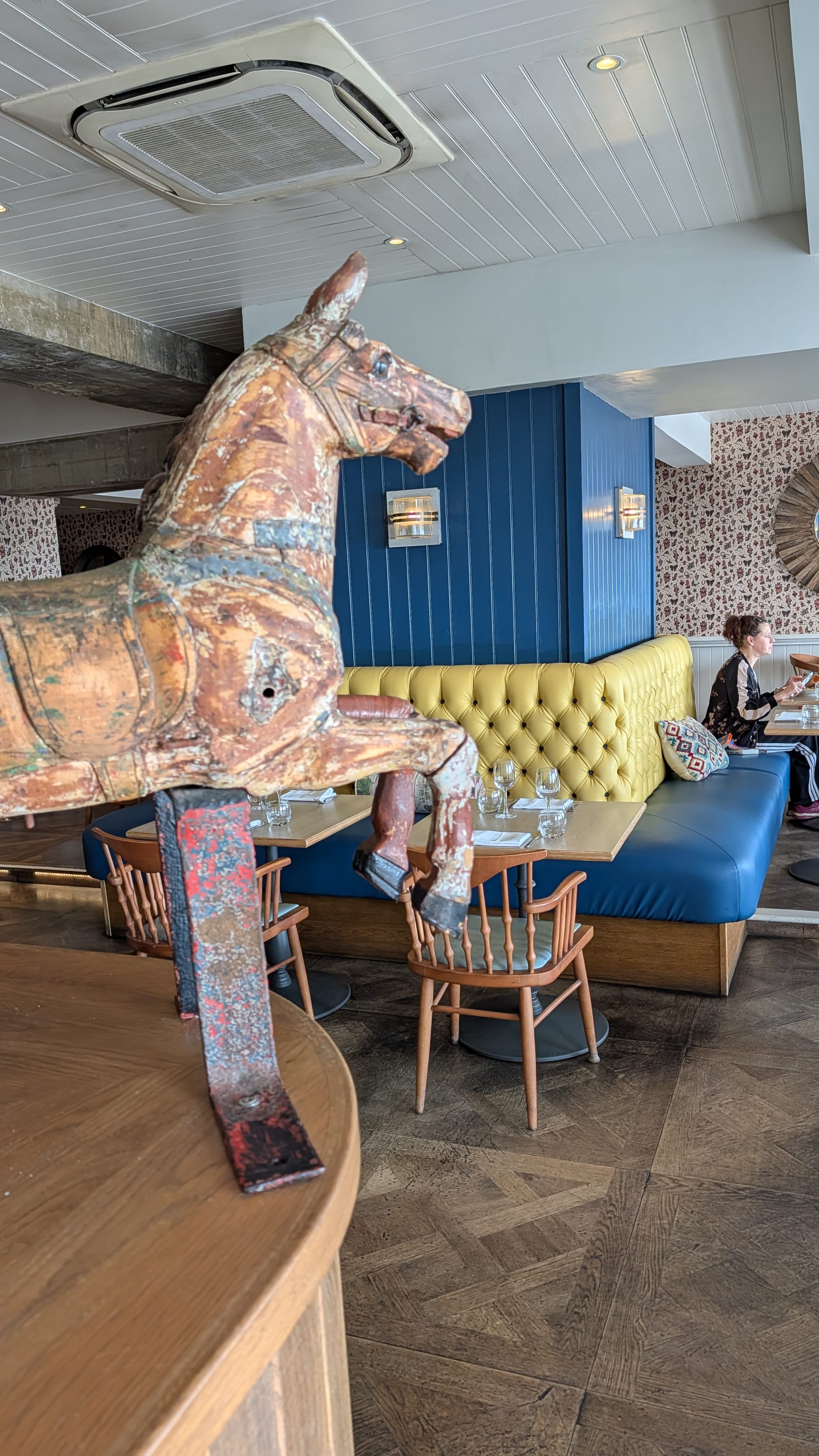 From the moment we arrived, the space had a playful, fun energy whilst still feeling cosy and welcoming. It was packed with groups of friends, couples on dates and celebrations, which really added to the atmosphere. I loved how the décor leaned fully into the theme—carousel horses, funfair-style signage and pops of brightness—balanced with neutral tones so it never felt over the top.