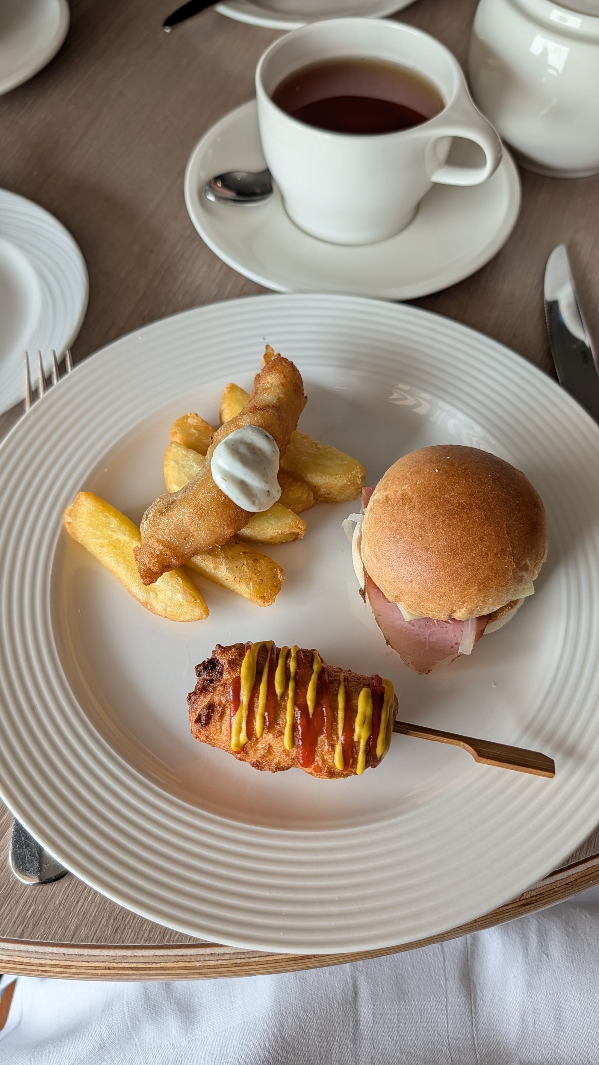 The savoury selection was full of flavour and cleverly tied into that seaside feel. We were served mini fish & chips with tartare sauce, a pastrami and Reuben brioche roll with pretzel, sauerkraut and emmental cheese, and a British corn dog with ketchup and mustard. The corn dog was a real surprise standout—packed with flavour and that perfectly satisfying sausage centre.