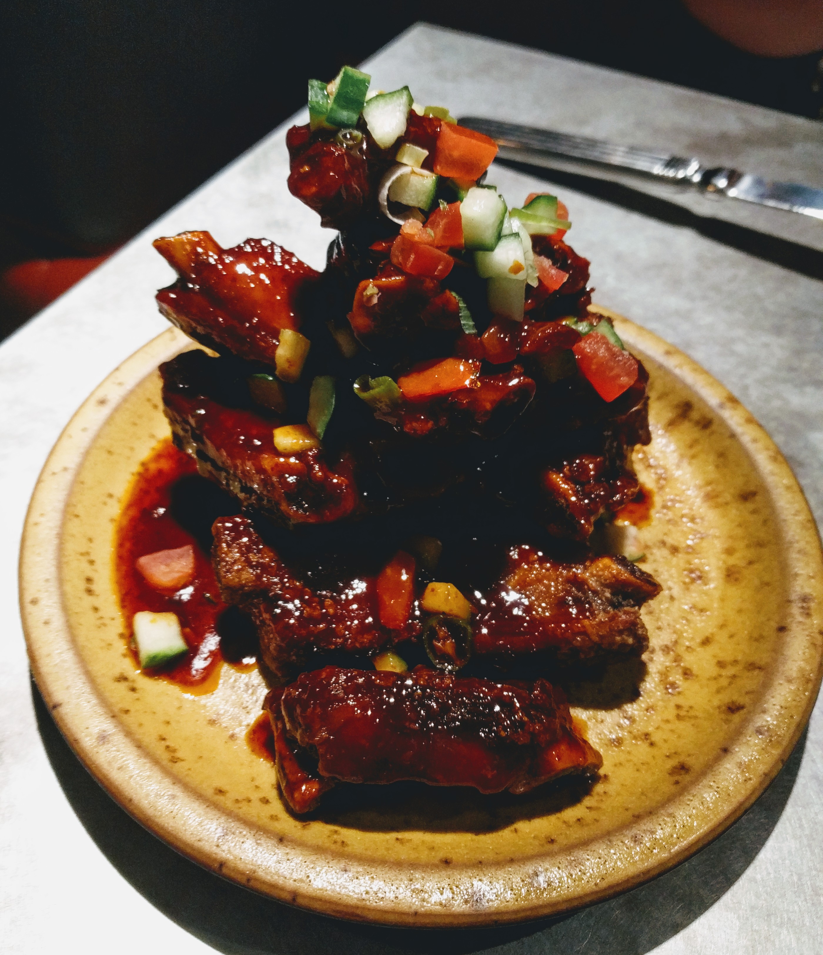 I have never had a lot of crab dishes, but this was amazing - possibly my dish of the evening, although it is extremely hard to pick! The convenience of being able to eat the whole crab encases in a supremely light lentil batter & beautifully balanced spicy sauce was delightful. The Nagaland spiced ribs glistening with sweet & spicy BBQ sauce are an unexpected item on an Indian menu, but definitely worth the mess! Thankfully they provide you with little wet-wipe packets, and as if they knew me they gave me extra!