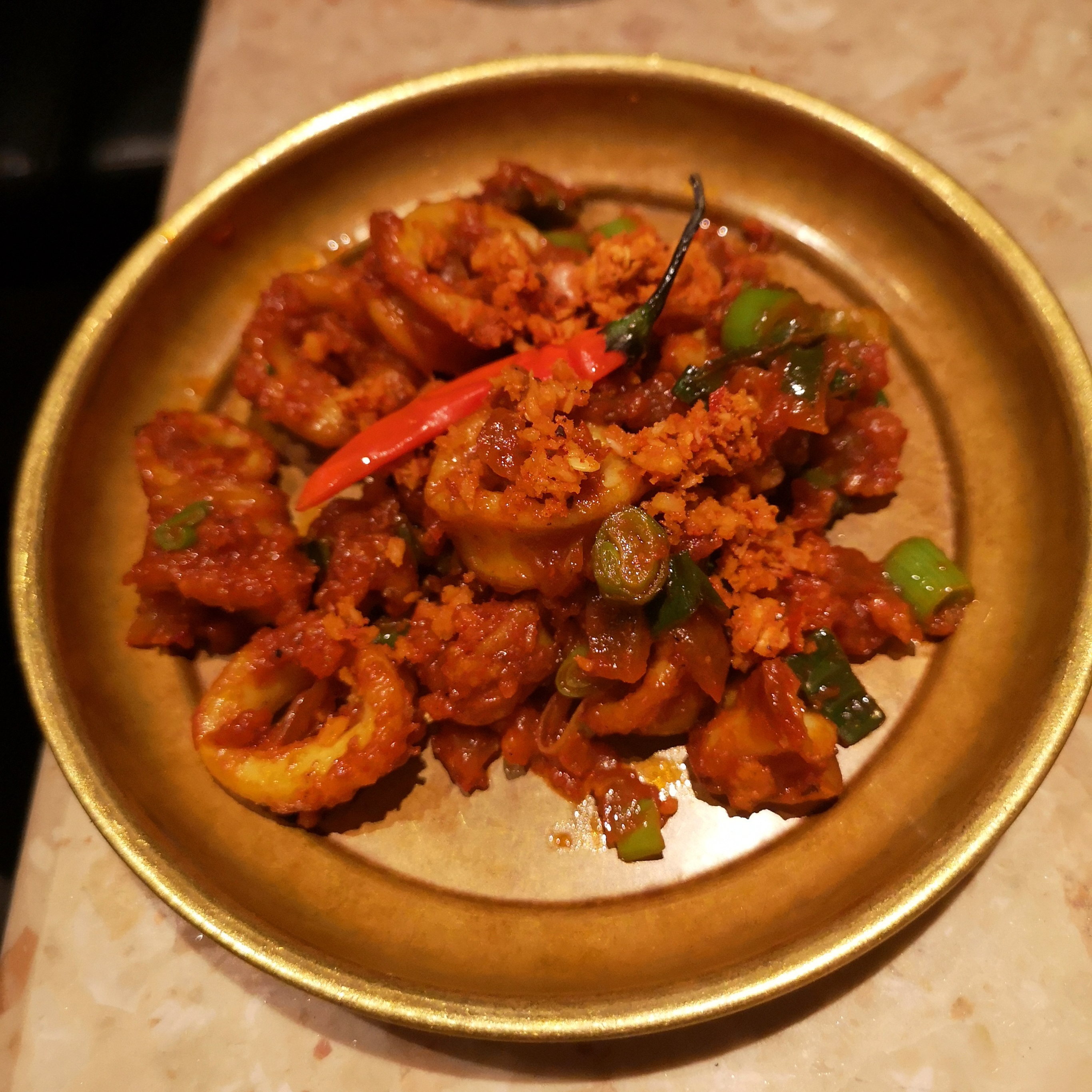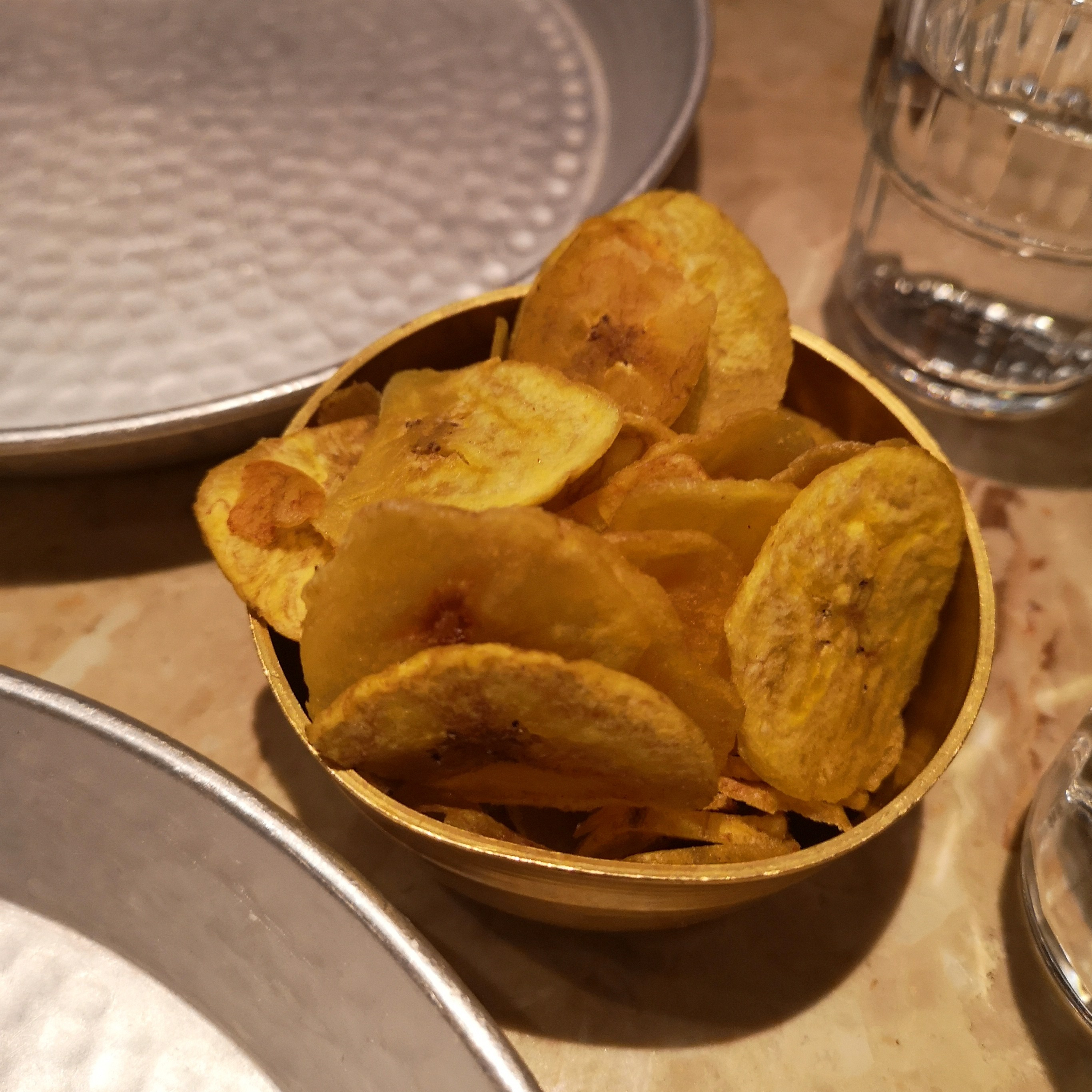 One thing I will mention is the tasting menu has a lot of elements (there are 5 starters alone!) which means you end up with a lot of food on the small table at once to play table tetris with! We started with some banana chips and a spicy devilled chilli squid. Beware although beautiful & packed with succulent squid, as the name suggests there is a kick from the devil in this dish!