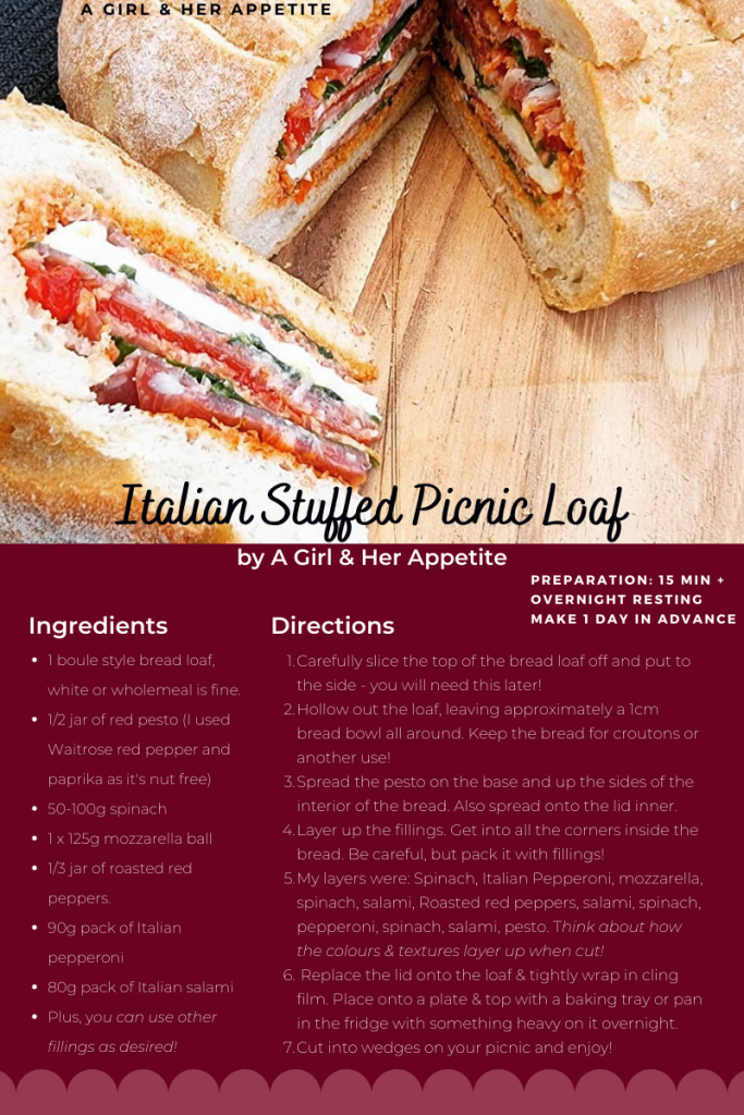 There are endless possibilities for the fillings in a stuffed picnic loaf, you can completely go to town on the fillings you love or work to a theme of meats, cheeses and other fillings. It is so customisable to your preferences, which I love!