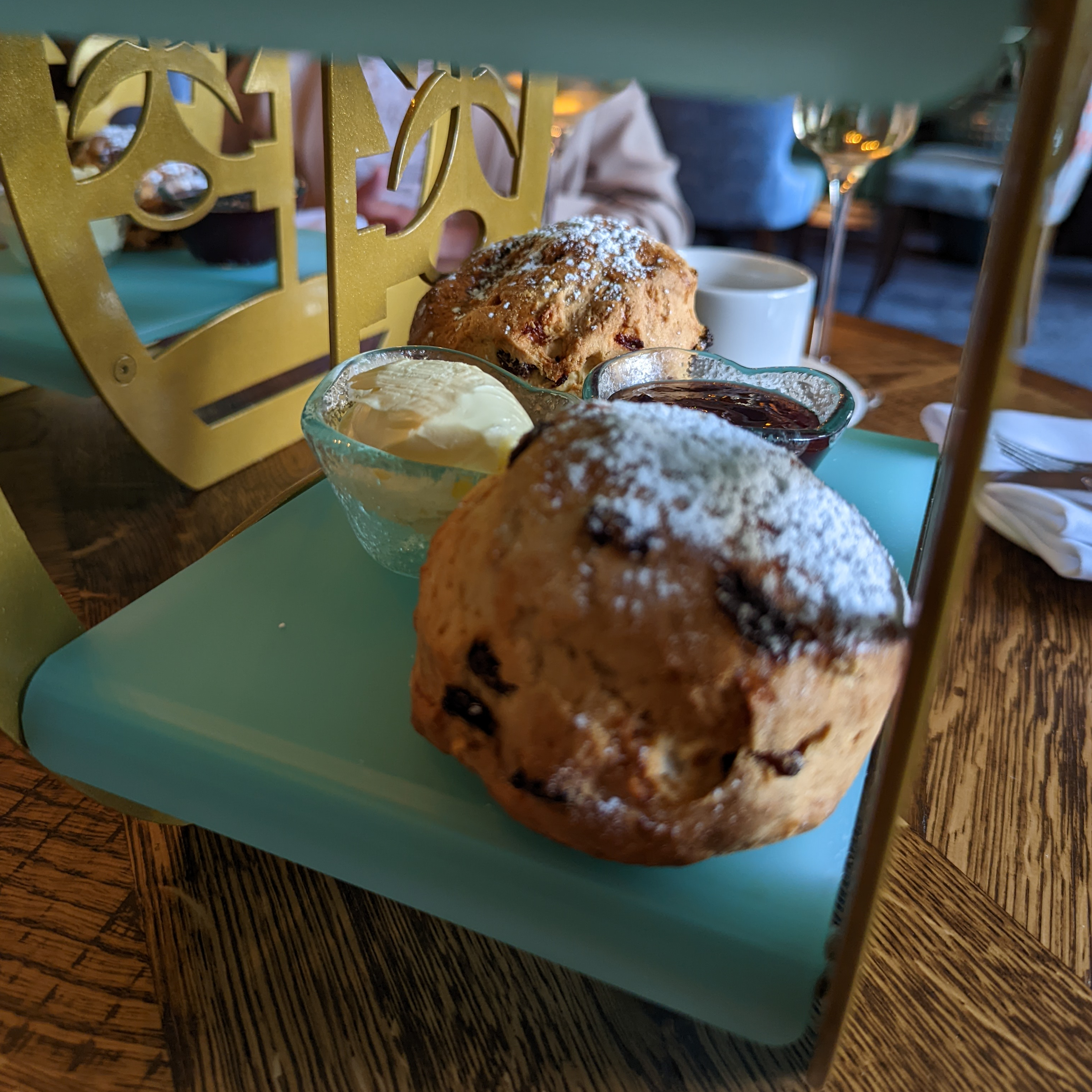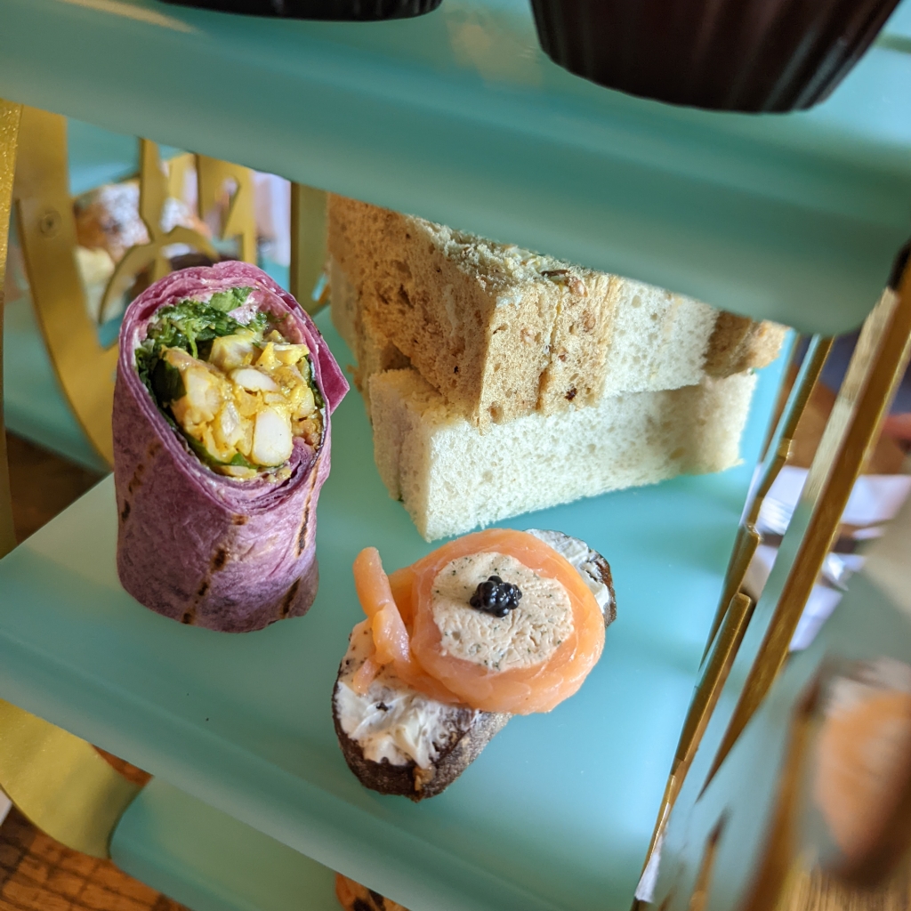 We visited for the Jubilee, and the sandwich course had a mixture of classics and Jubilee themed elements. Allergens are considered, as always it's best to info them at time of booking and before the platter was served we were given the opportunity to request any swaps. The classics included two sandwich fingers; a cucumber and hummus on white bread and a free range egg mayo & cress on malted bread.