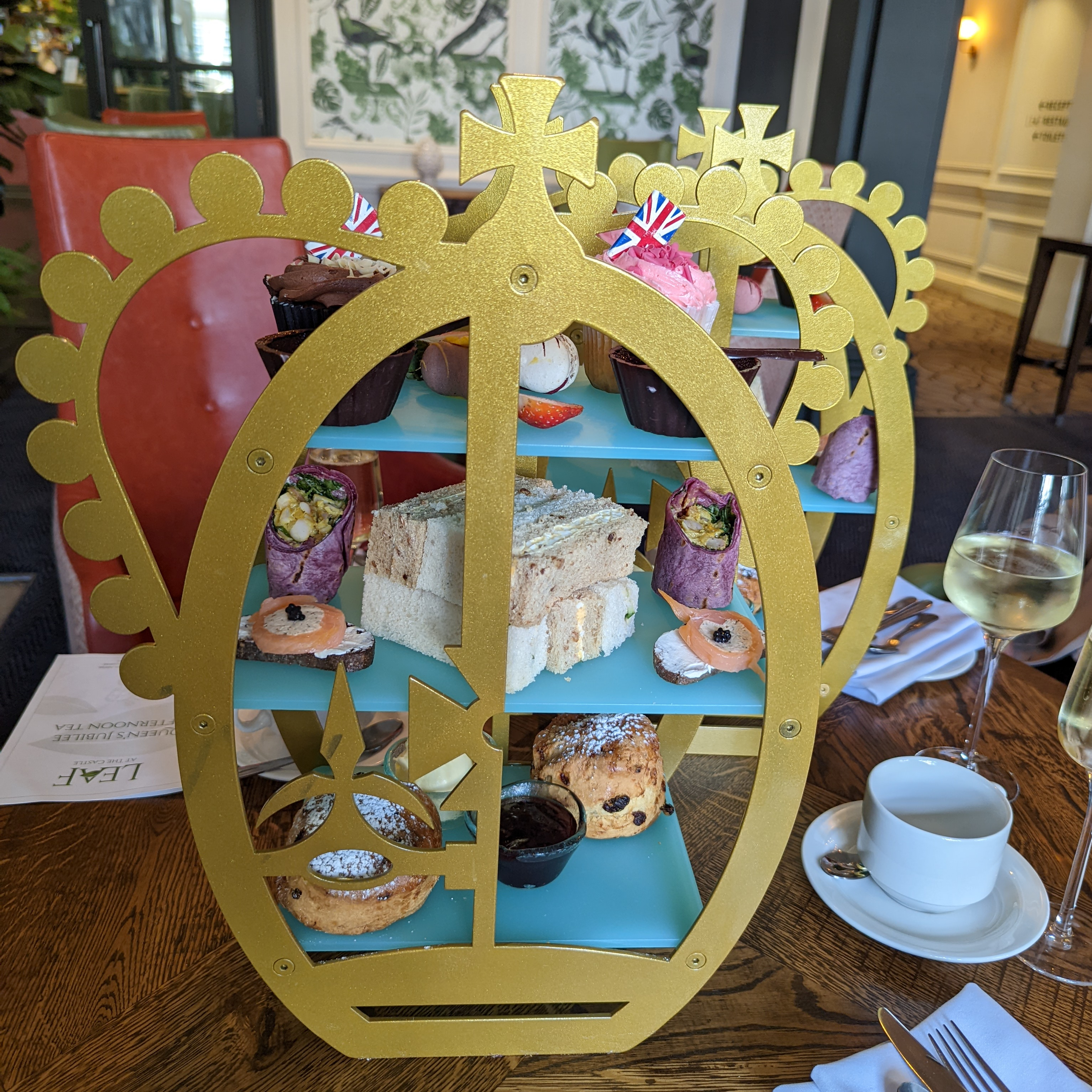 My favourites were the updated Afternoon tea classics! A Severn & Wye smoked salmon pinwheel with chive cream cheese was served on rye bread with the elegant addition of caviar. The savoury elements were finished with a Jubilee Coronation chicken in a vibrant red wrap.