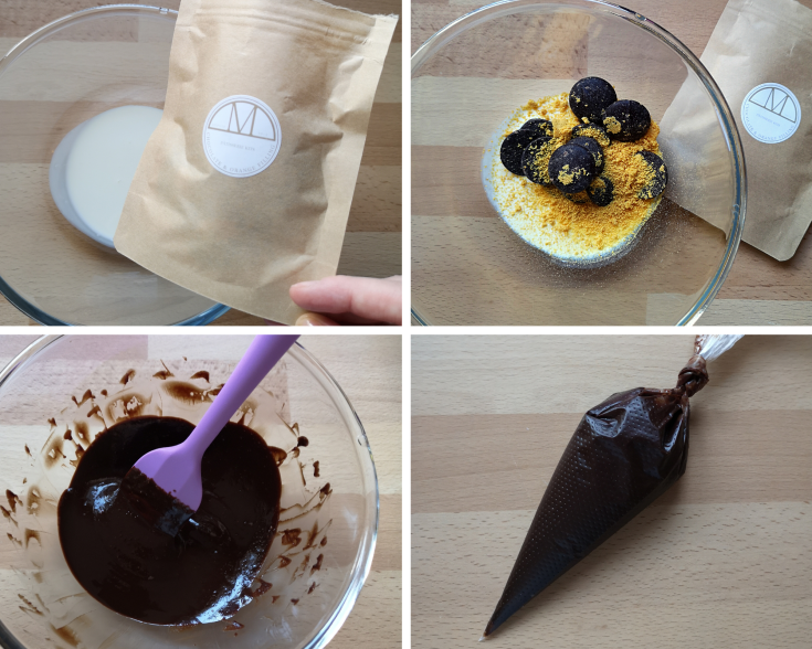 The first stage of the bake is to make the chocolate orange ganache filling. For this you add your double cream (one of the ingredients you have to supply as it is perishable!) to a microwave bowl and add the vegan chocolate and orange powder from the kit that is clearly labelled. The orange powder smelt amazing & I knew would make a delicious flavoured filling. This was heated in short bursts until smooth & glossy. Then I spooned it into one of the piping bags provided and left to cool.
