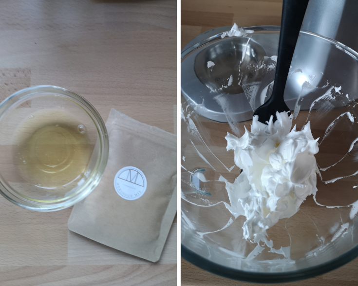 The egg whites (the only other ingredient you have to provide - or aquafaba for vegans) are beaten with the meringue sugar mix until you have stiff peaks. Then you add the last bag of dry ingredients provided, the macaron mix and fold through. Once combined well, to the consistency shown in the video, this can be put into another piping bag ready. I really loved that you can see the consistency and technique through the additional video tutorial.