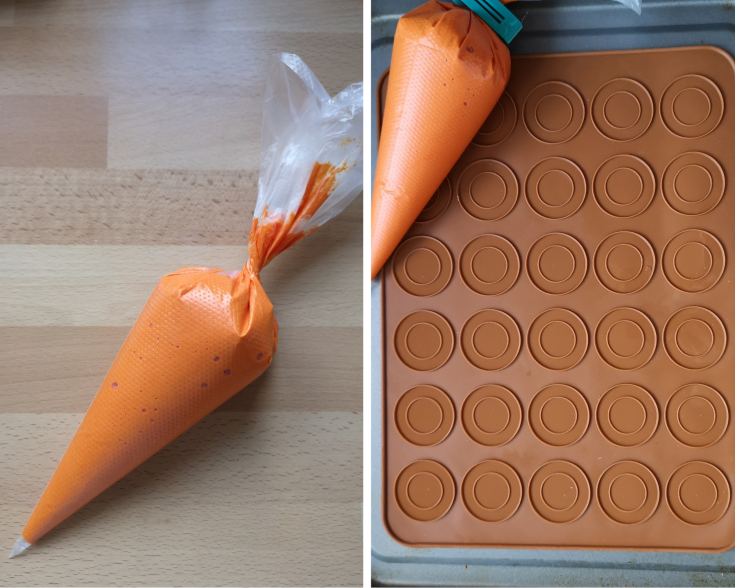 With the included macaron mould on a baking tray I piped the mixture and then tapped the tray firmly on the counter to remove any air bubbles in the shells. The tray must then be left to allow each shell to form a skin; the additional info that the time this takes is due to the humidity in the kitchen and how to check they skin is fully formed are great tips for the bake. The kind of thing you'd pick up at a face to face cooking class and often lack in normal recipes!