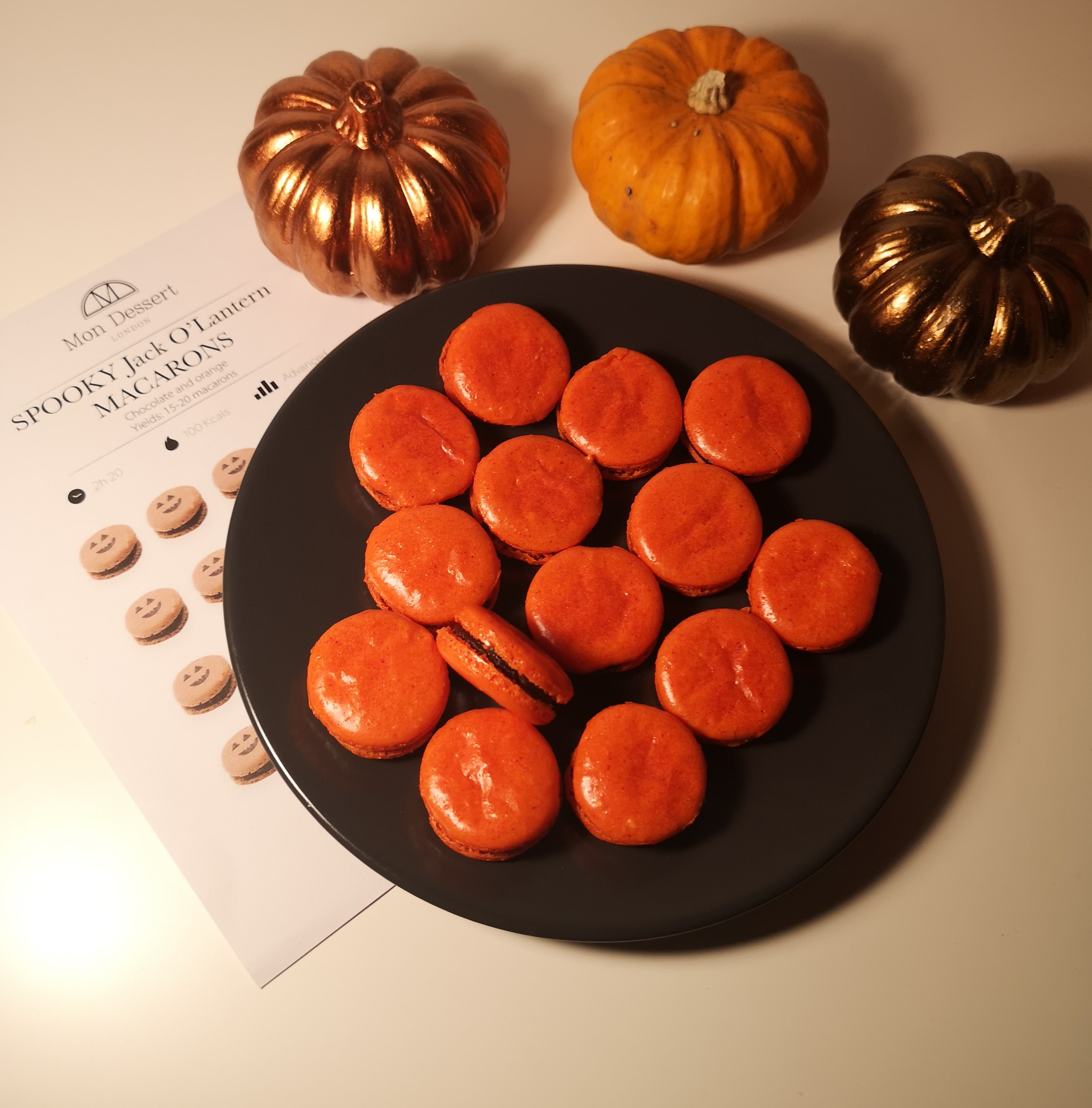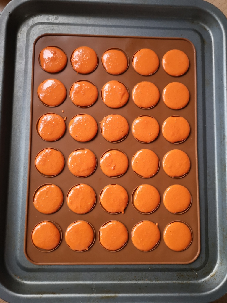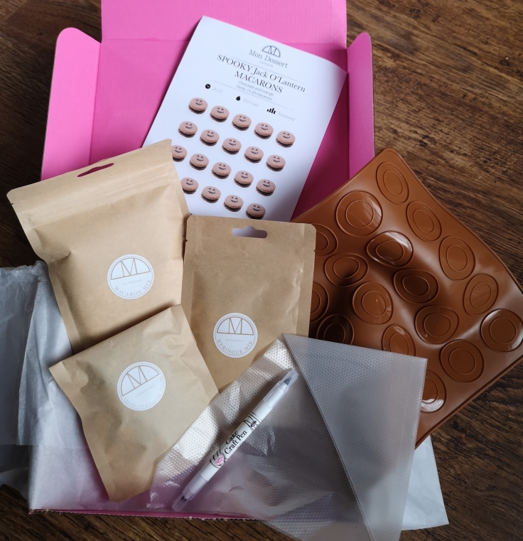 The kit I ordered was for chocolate orange (Jack O'Lantern) macarons, but as I made these a few weeks after Halloween I simply made these plain in their decoration! The kit contained: Macaron mix (60g ground almonds, 90g icing sugar), 33g meringue mix (sugar), chocolate orange filling (60g vegan chocolate and 5g orange powder), along with the reuseable macaron mould and piping bags.