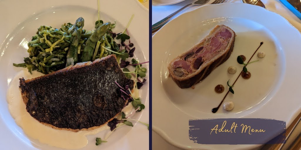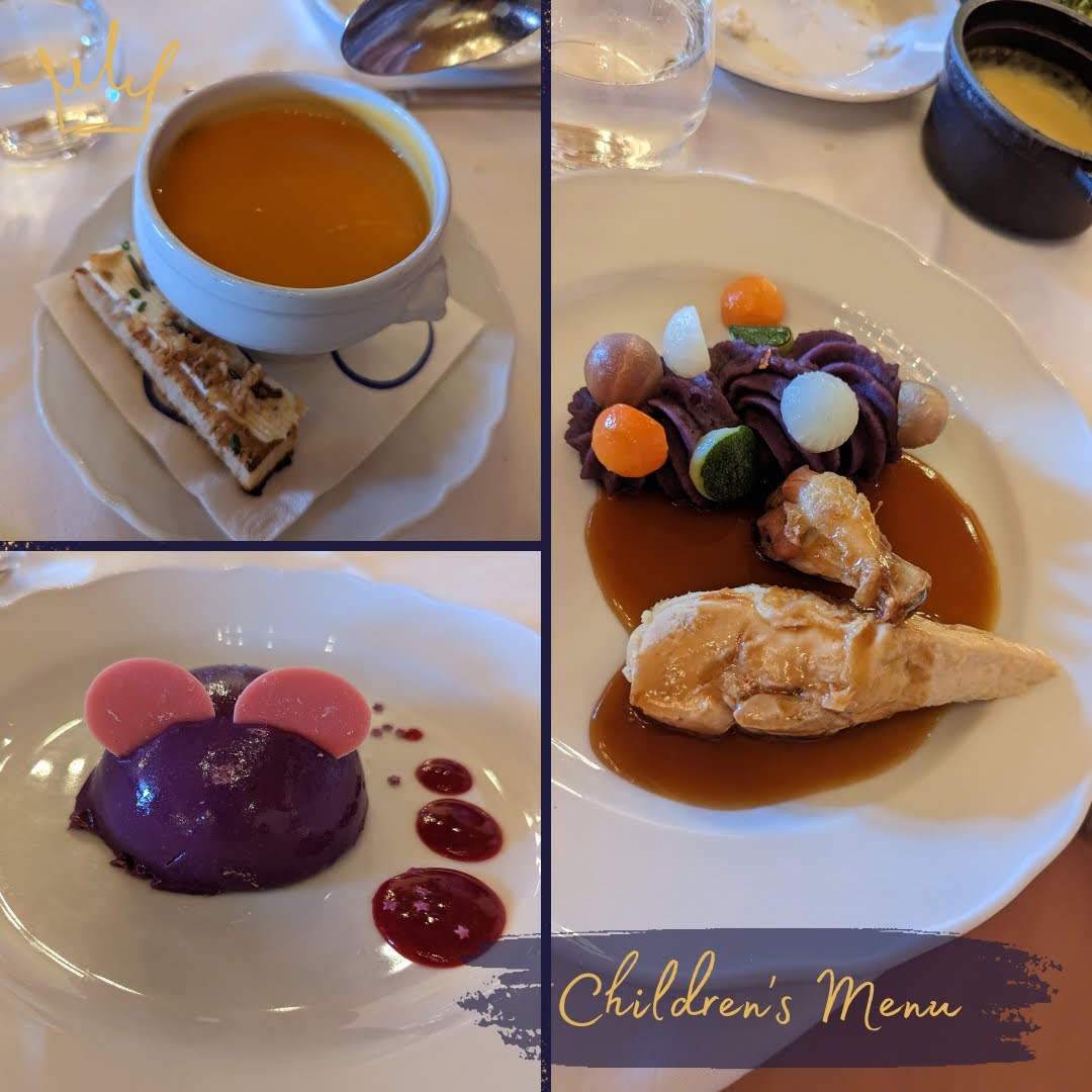 The children also get to select their dishes from a three course menu including a Fairy Canapé starter of pumpkin soup with and open cheese sandwich, a main roasted chicken with crushed violet potatoes and Mickey shaped vegetables followed by a Mickey mini Dome of chocolate sponge, mousse and orange compote!