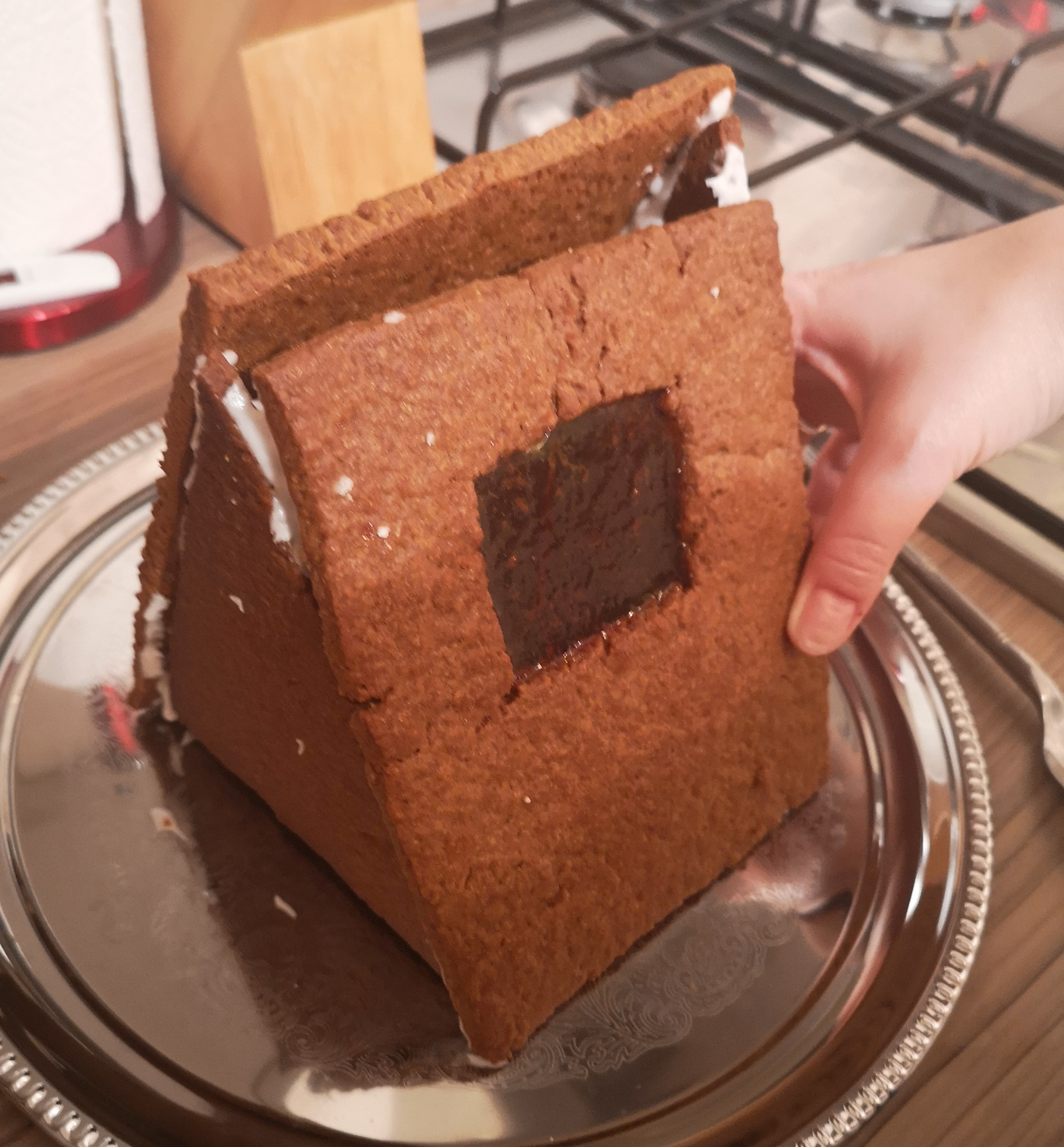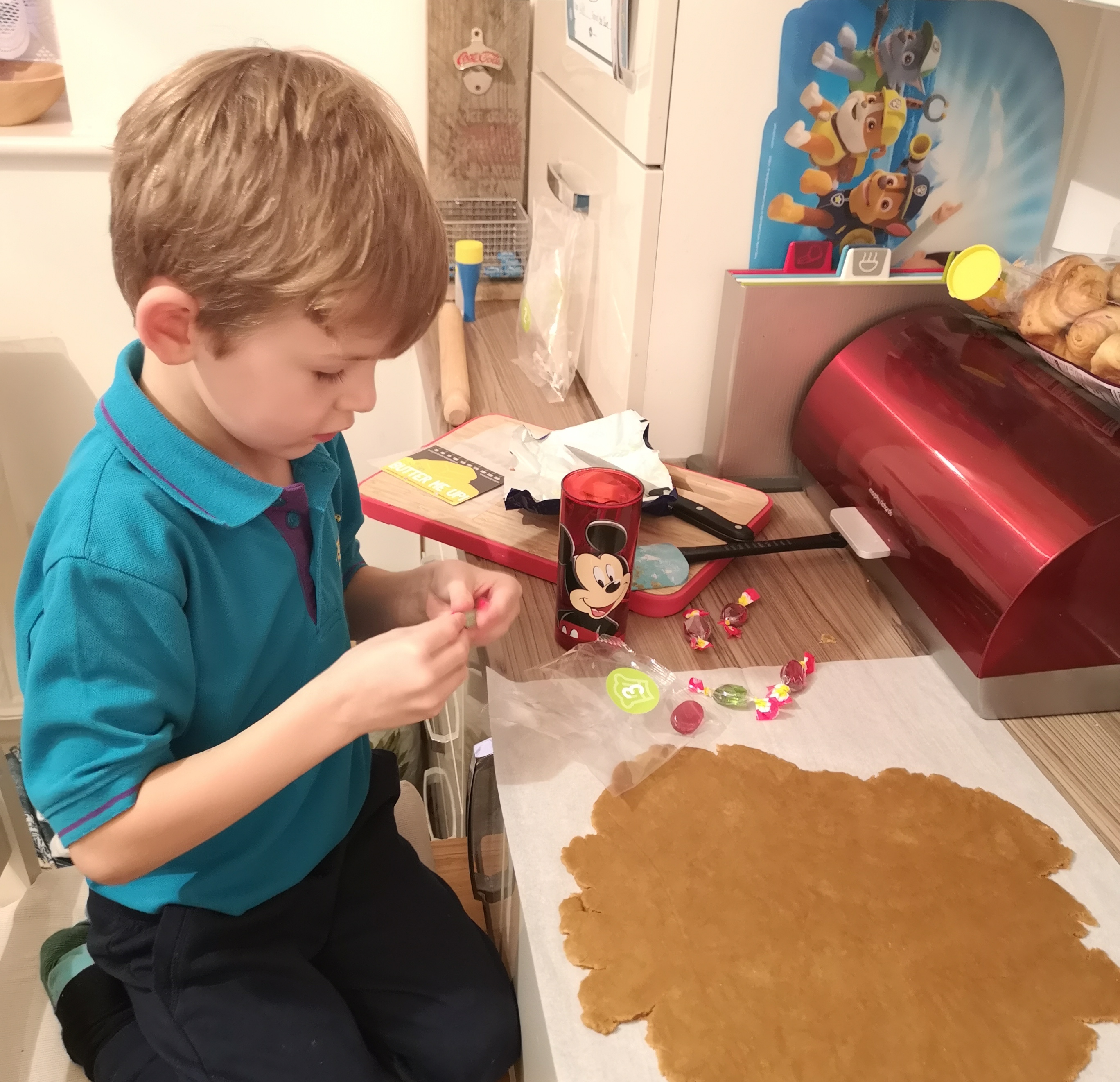 Once baked for roughly 12 minutes, we let all the pieces cool & started on preparing the decorations. Remember that the boiled sweets in the windows will be extremely hot and the Junior Chef should be kept away from it all whilst it cools to avoid any burns. Whilst they cooled we made the icing (pack 4) using an egg white to make a firm but still running consistency for construction glue!