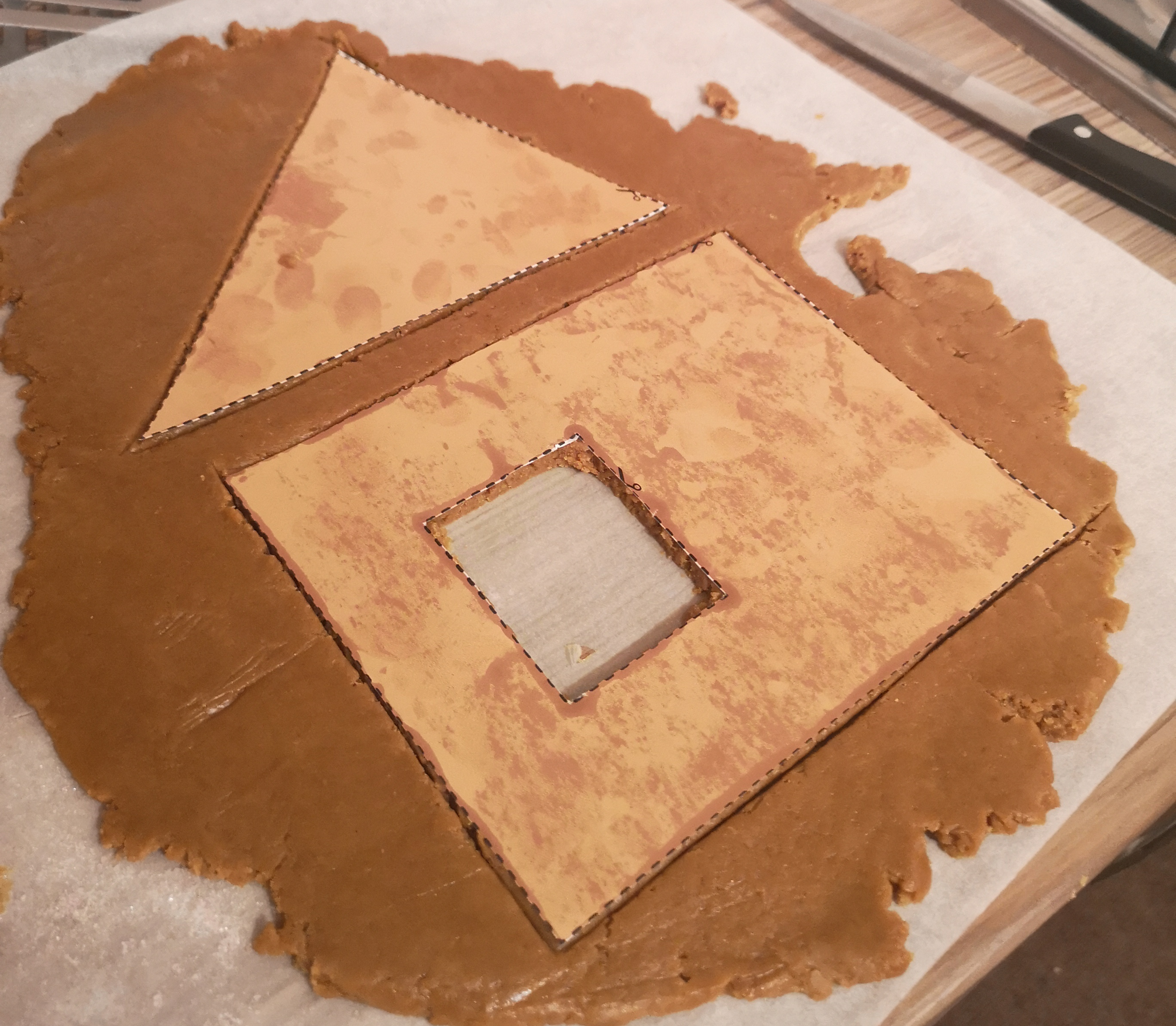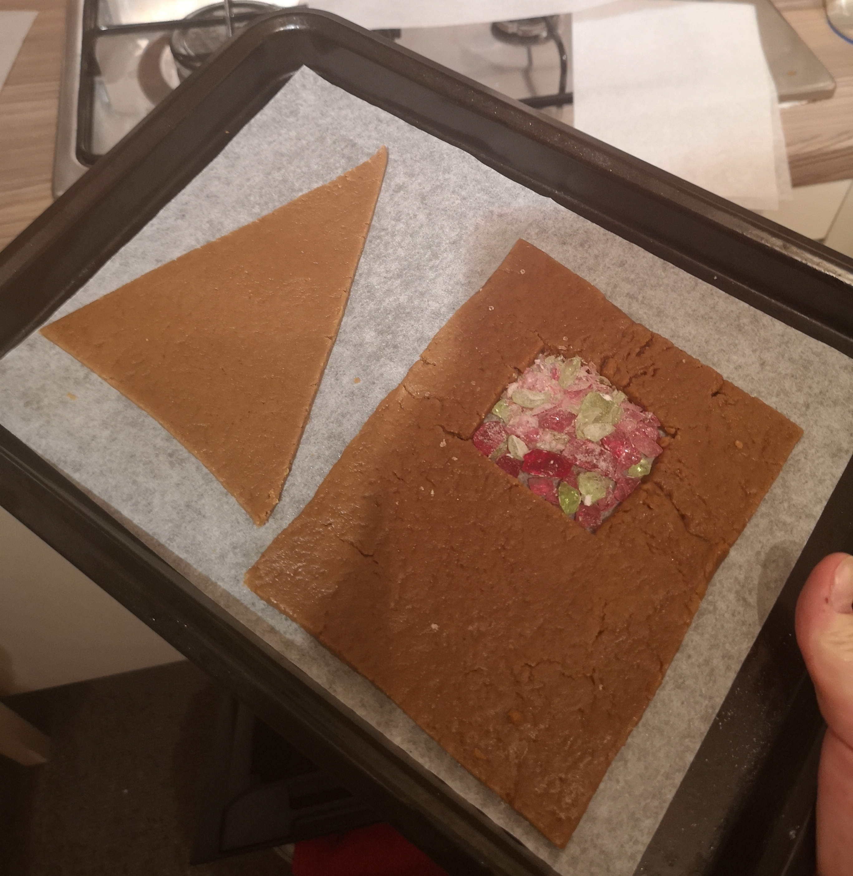 The kit came with pre-cut baking paper to roll the dough out between, a great little touch! Once rolled out we used the included templates to cut out two sides and two doors, with little holes for windows. In these we added crushed boiled sweets to make 'stained glass' windows. This definitely took me back to days making stained glass biscuits with my family when I was younger.